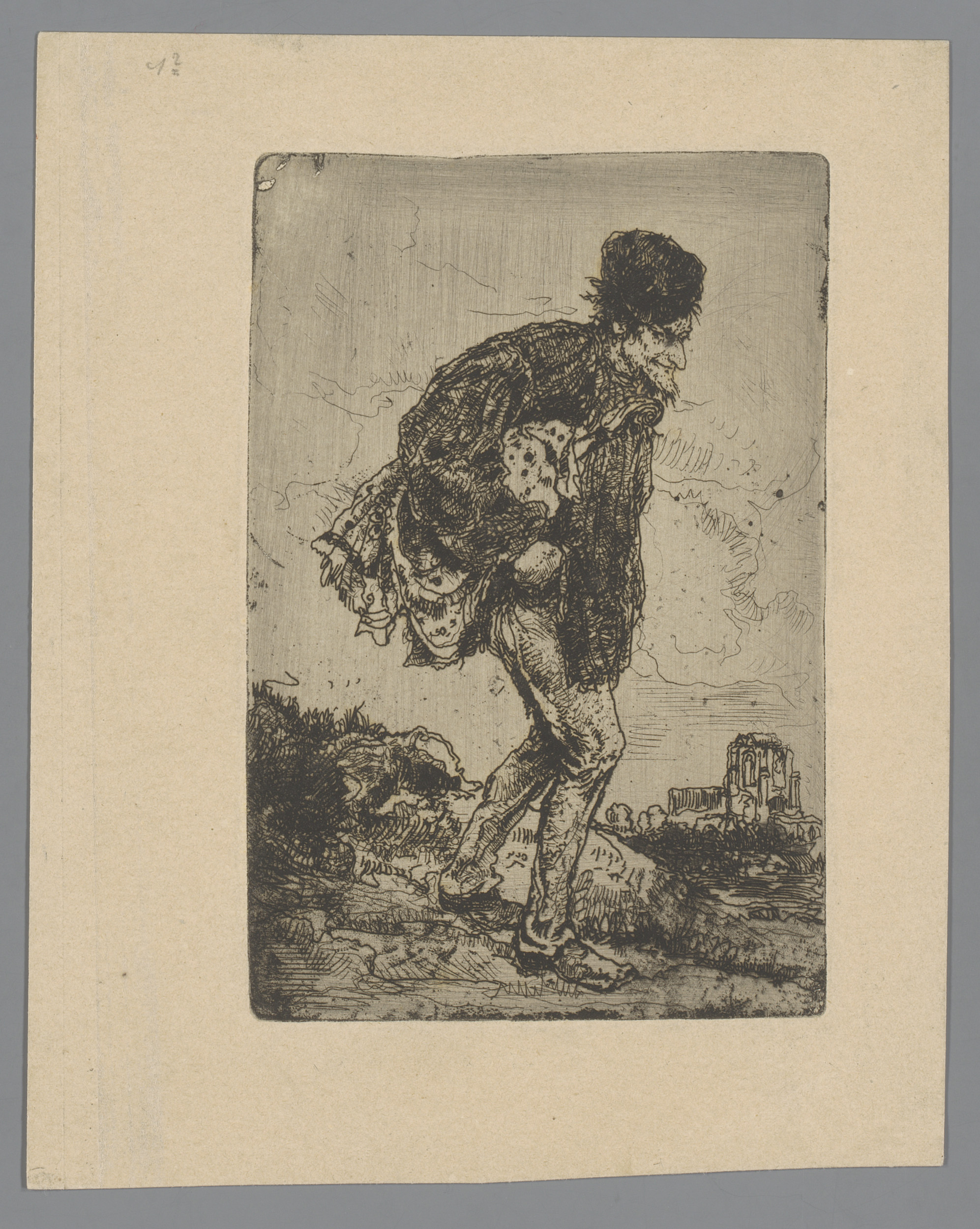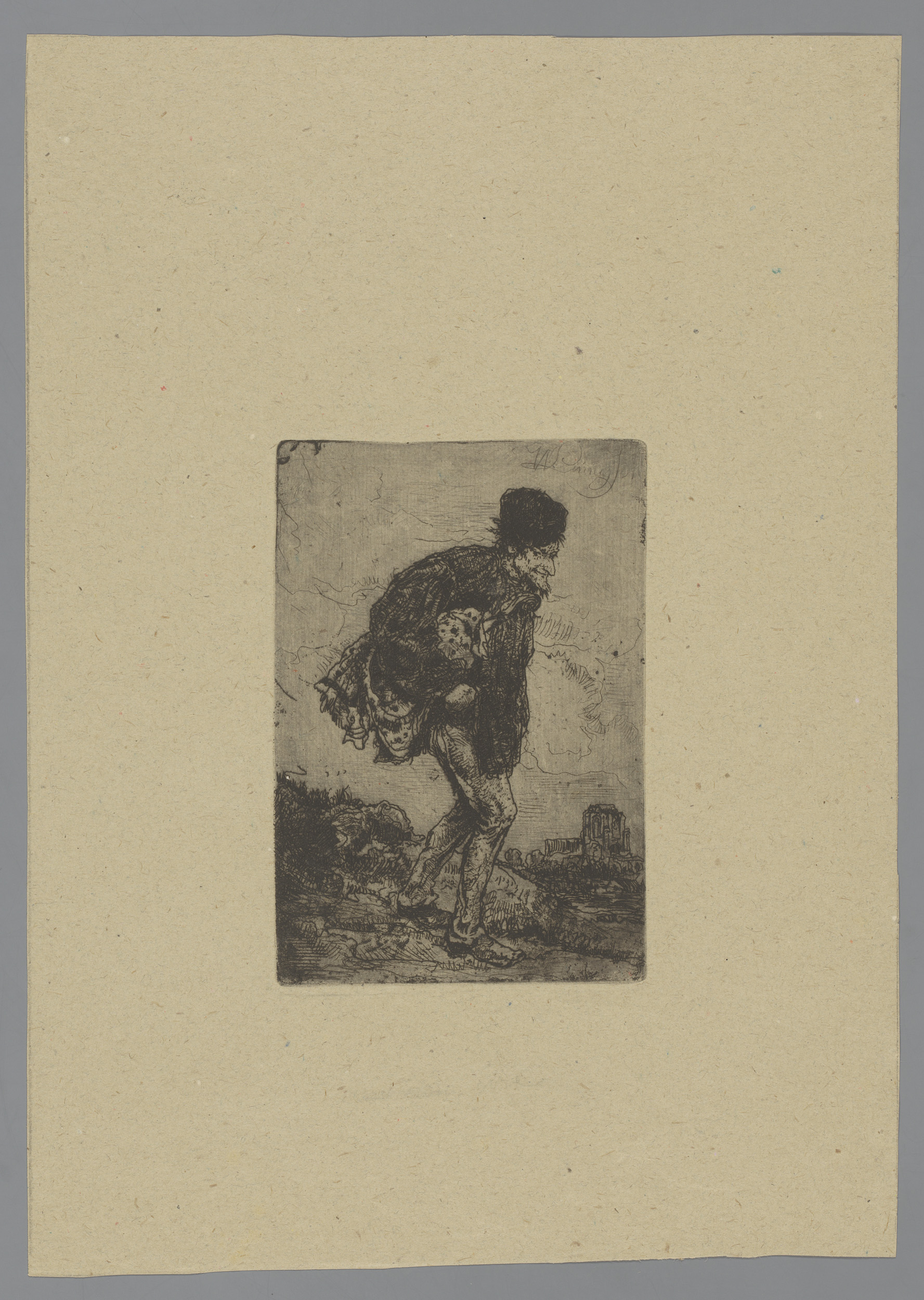 Lopende man met onder zijn arm een in een doek gewik...