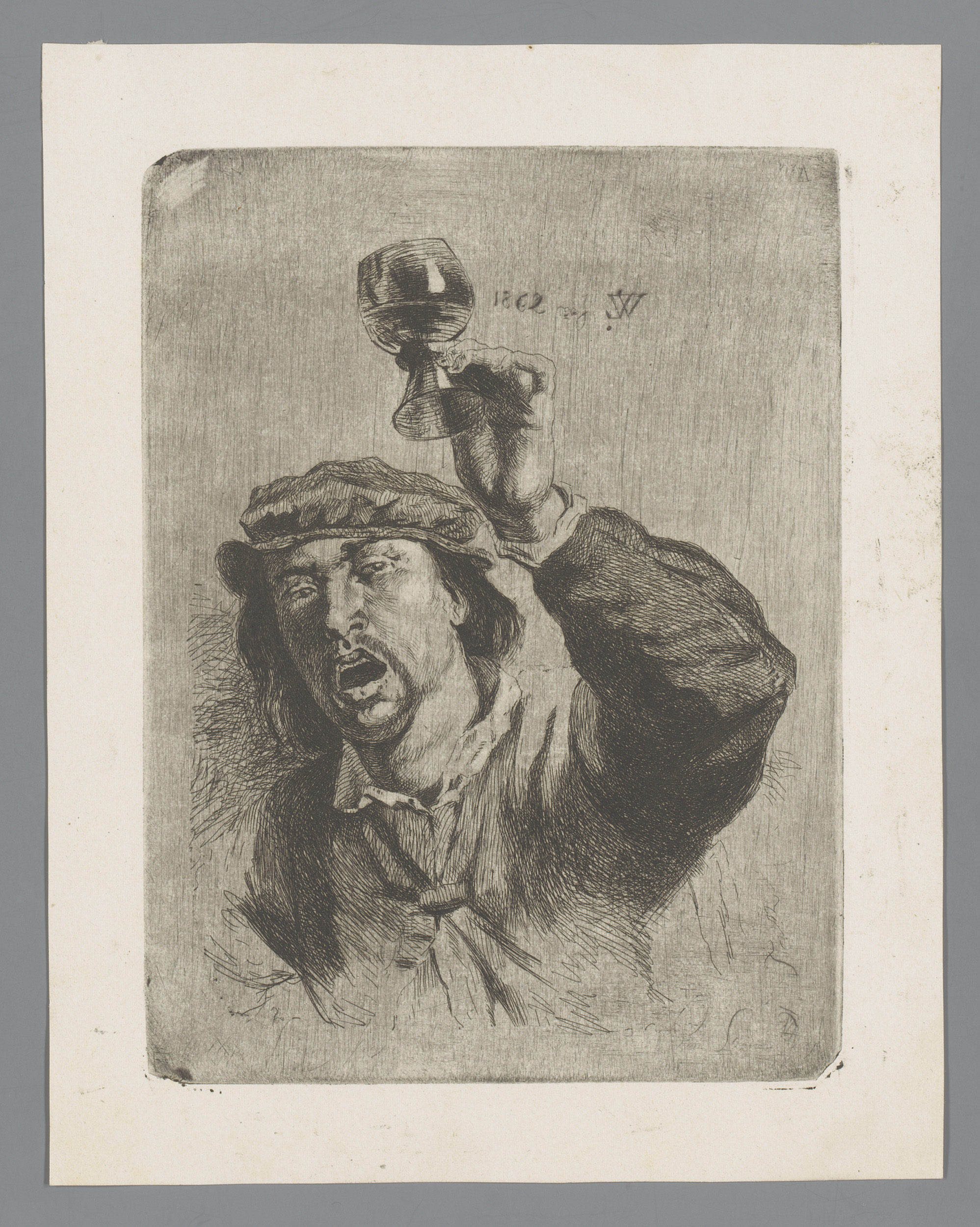 Man met open mond en geheven glas