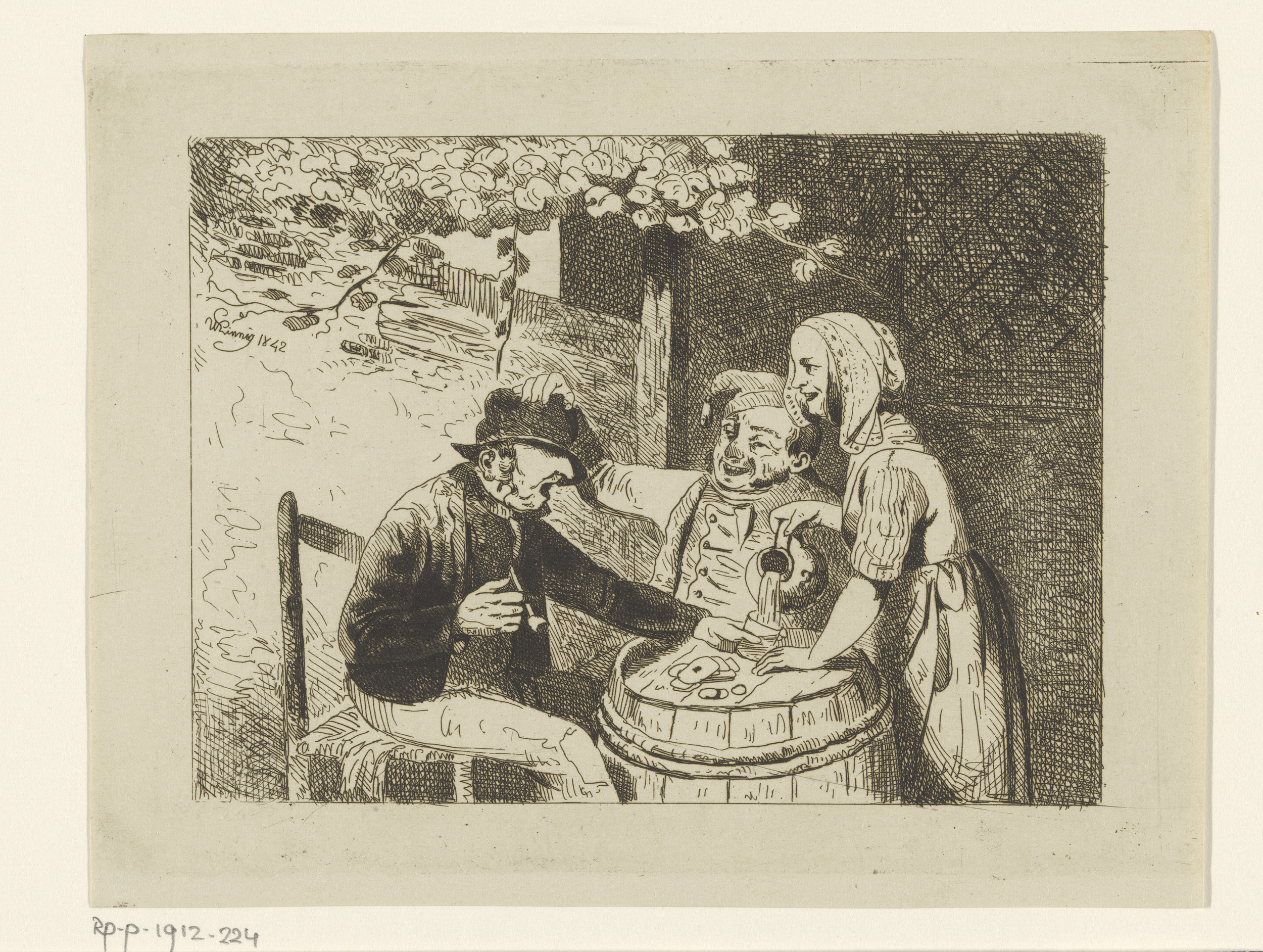 Vrouw schenkt een glas in voor twee kaartende mannen