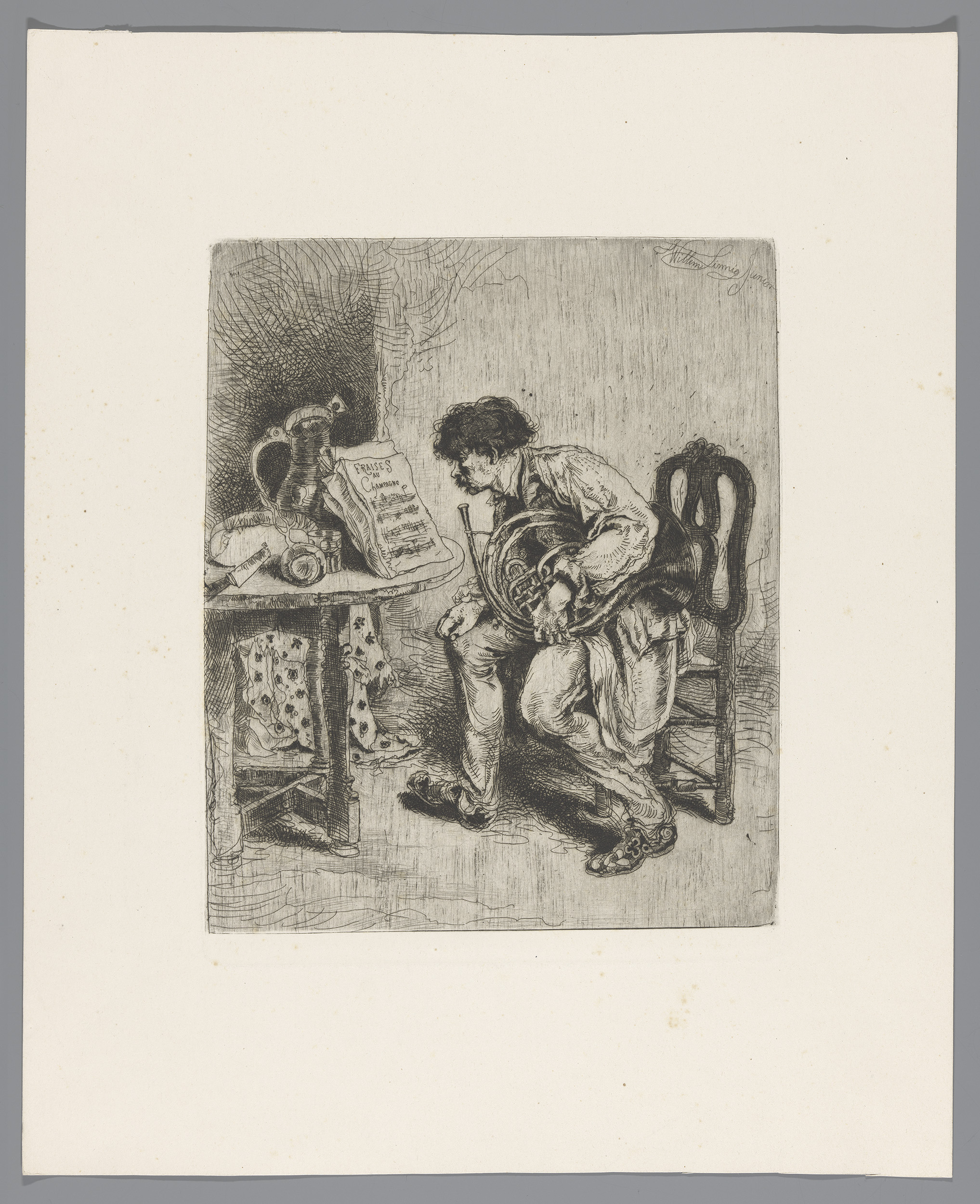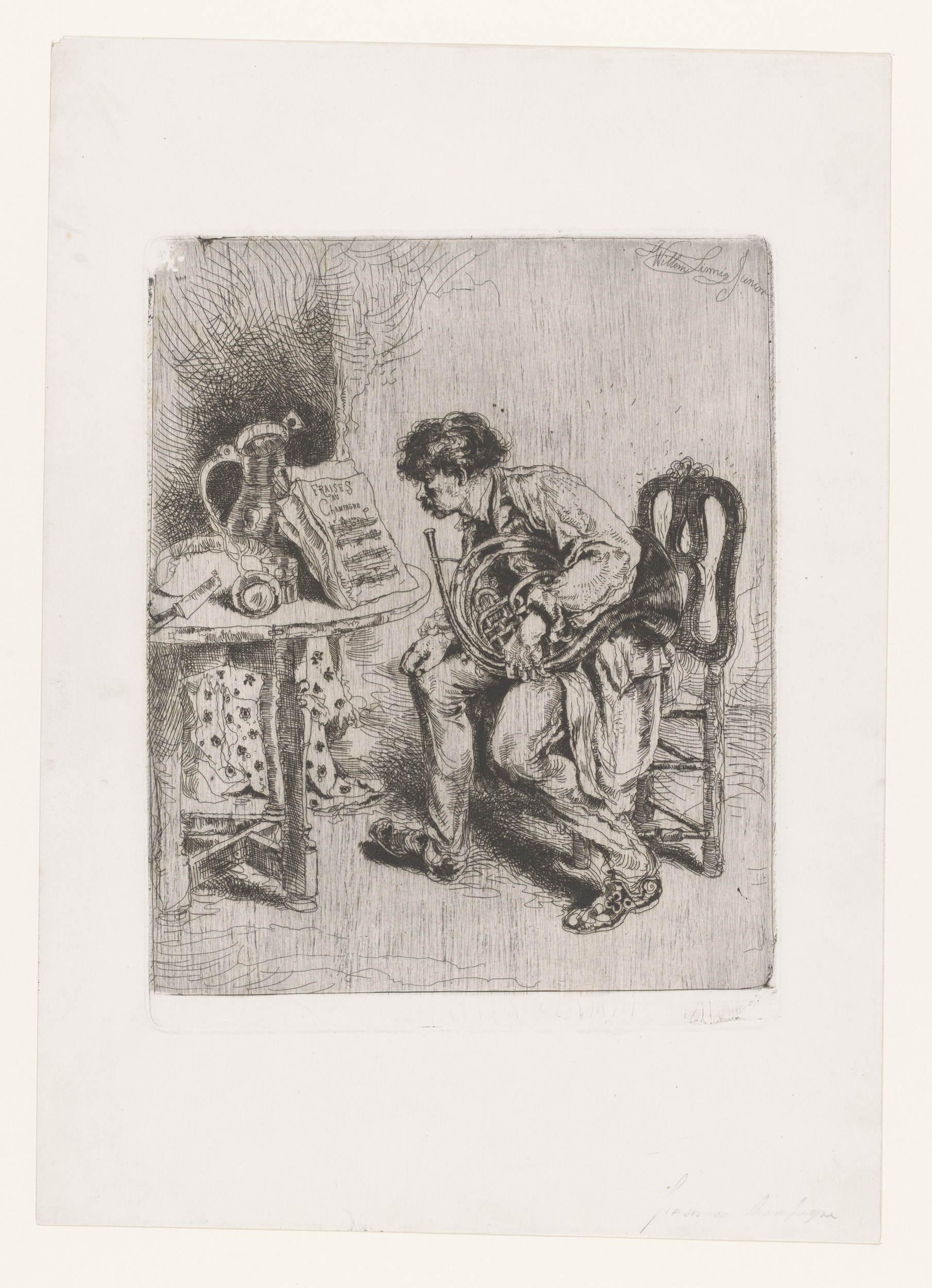 Hoornist bestudeert de bladmuziek Fraises au Champagne