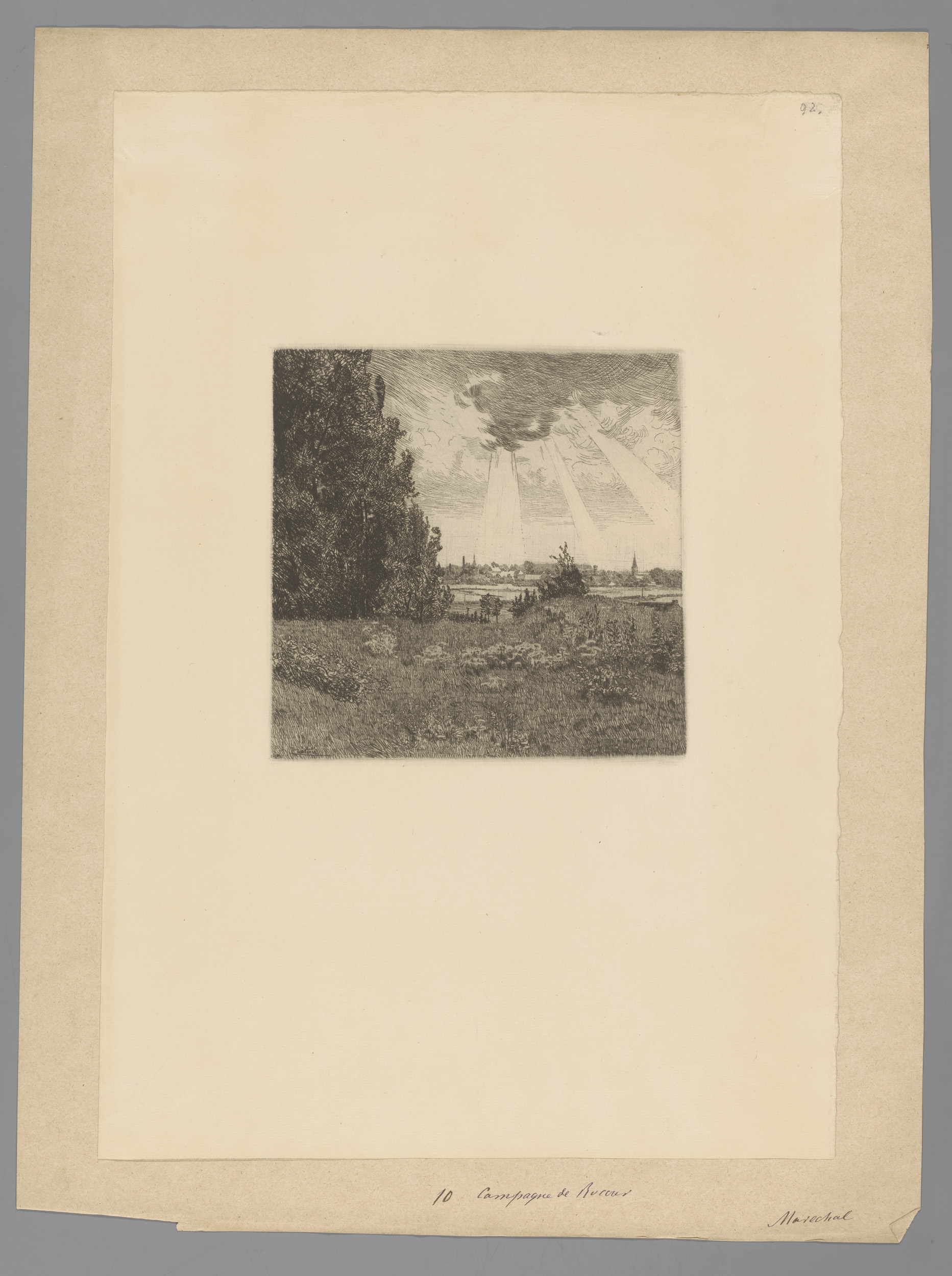 Landschap met zonnestralen en een gezicht op Rocourt