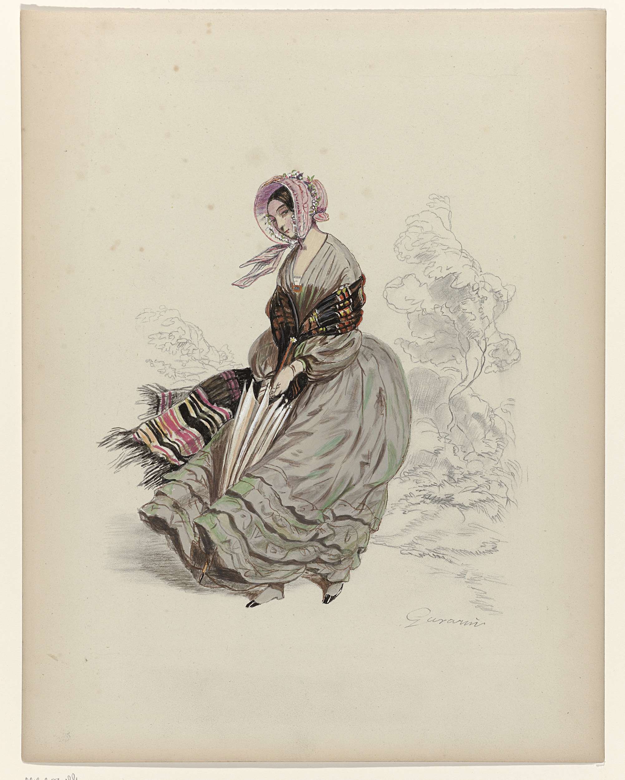 Vrouw, lopend in de wind, met parasol, 1840
