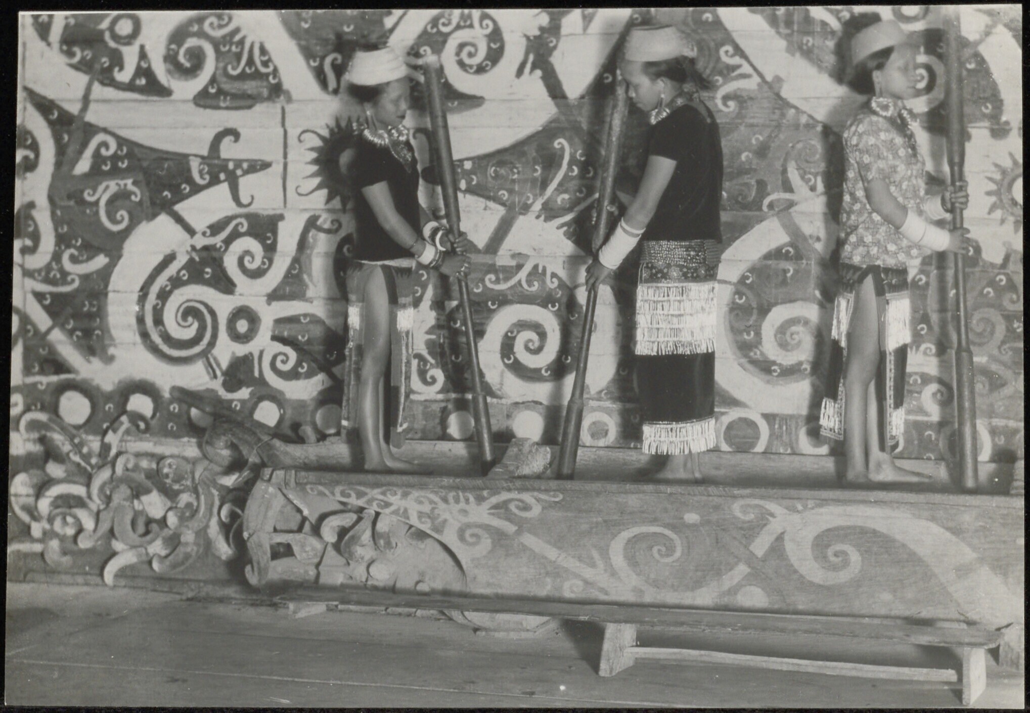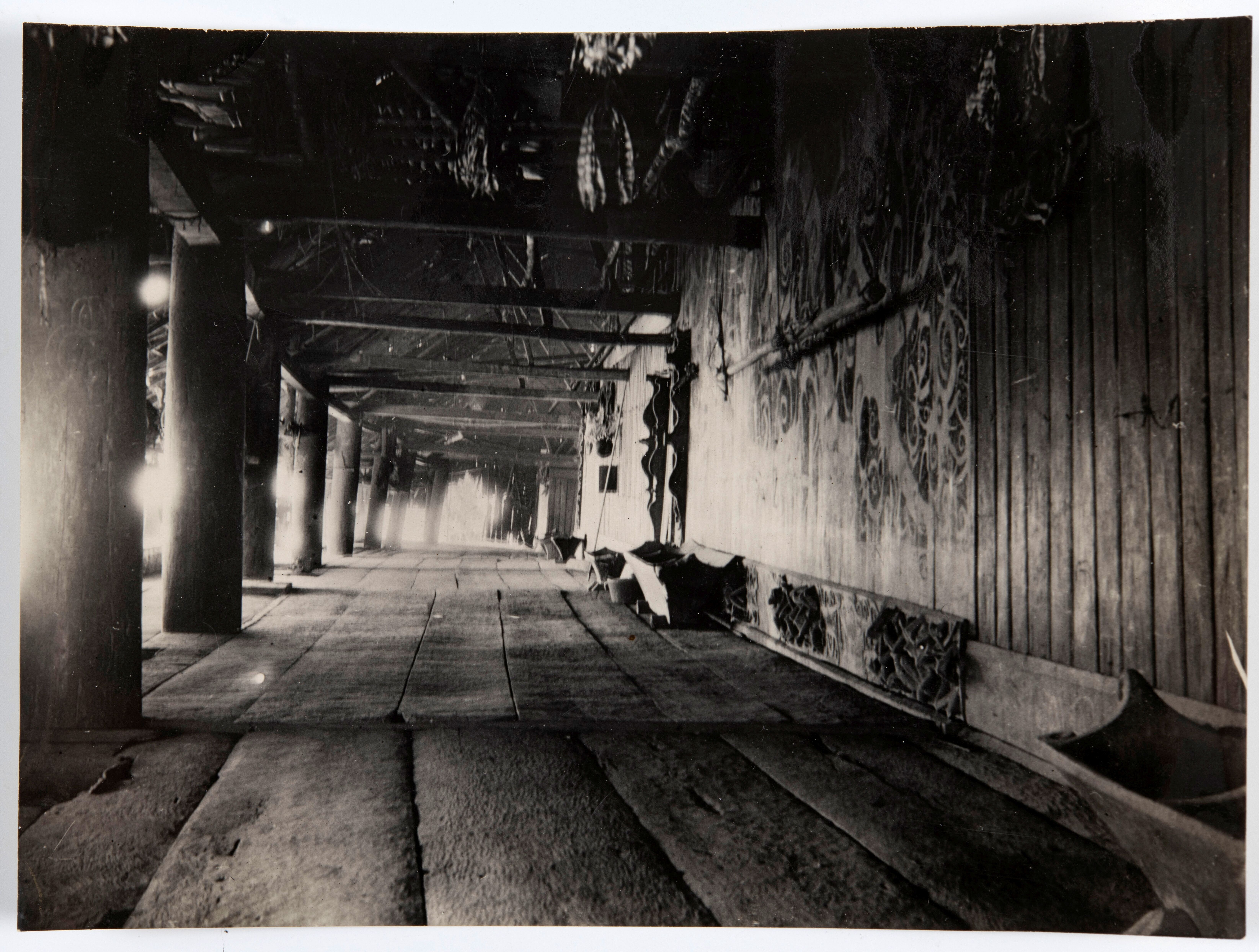 Interieur van een langhuis met houtsnijwerk