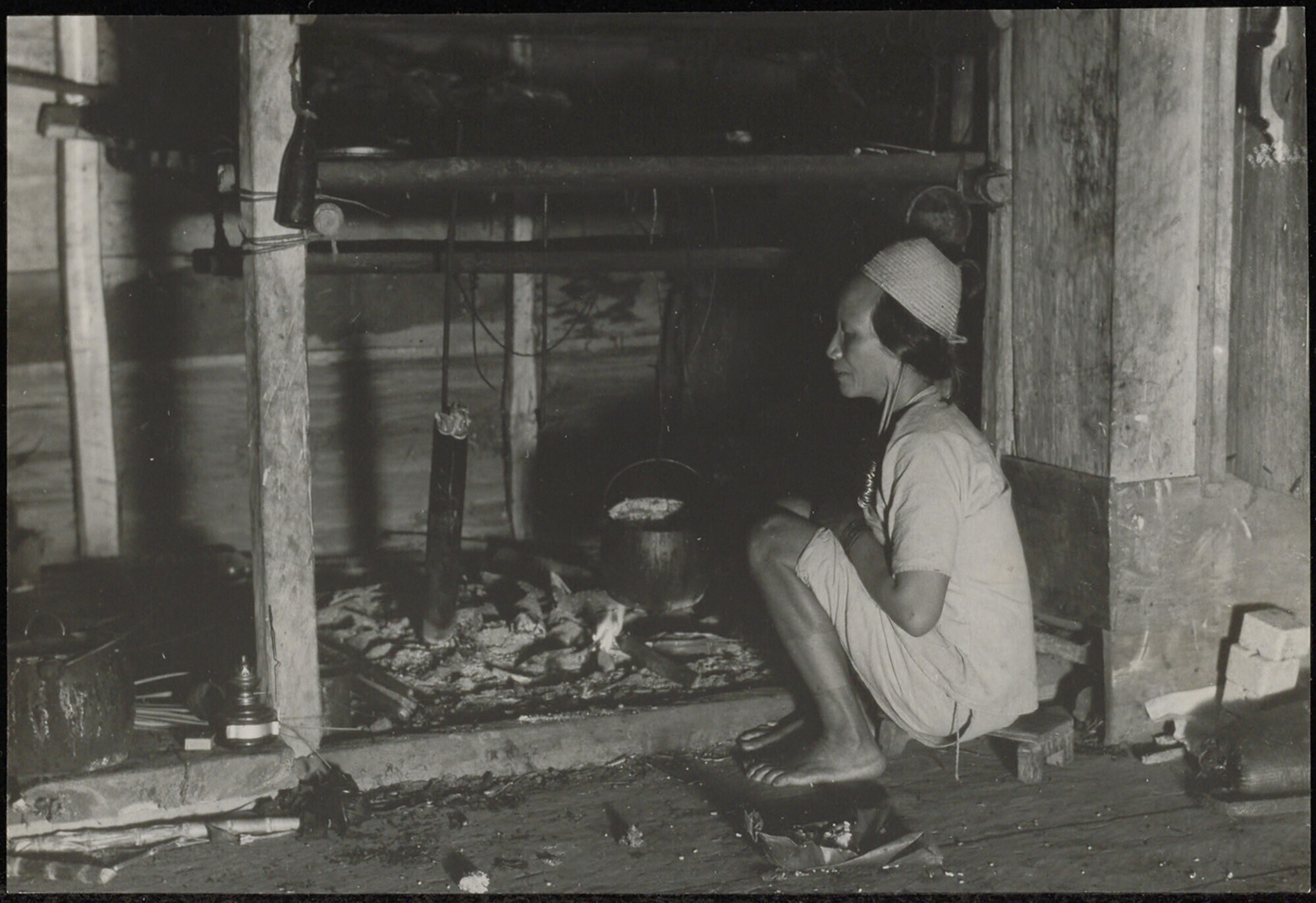 Gehurkt zittende vrouw bij een stookplaats in een huis