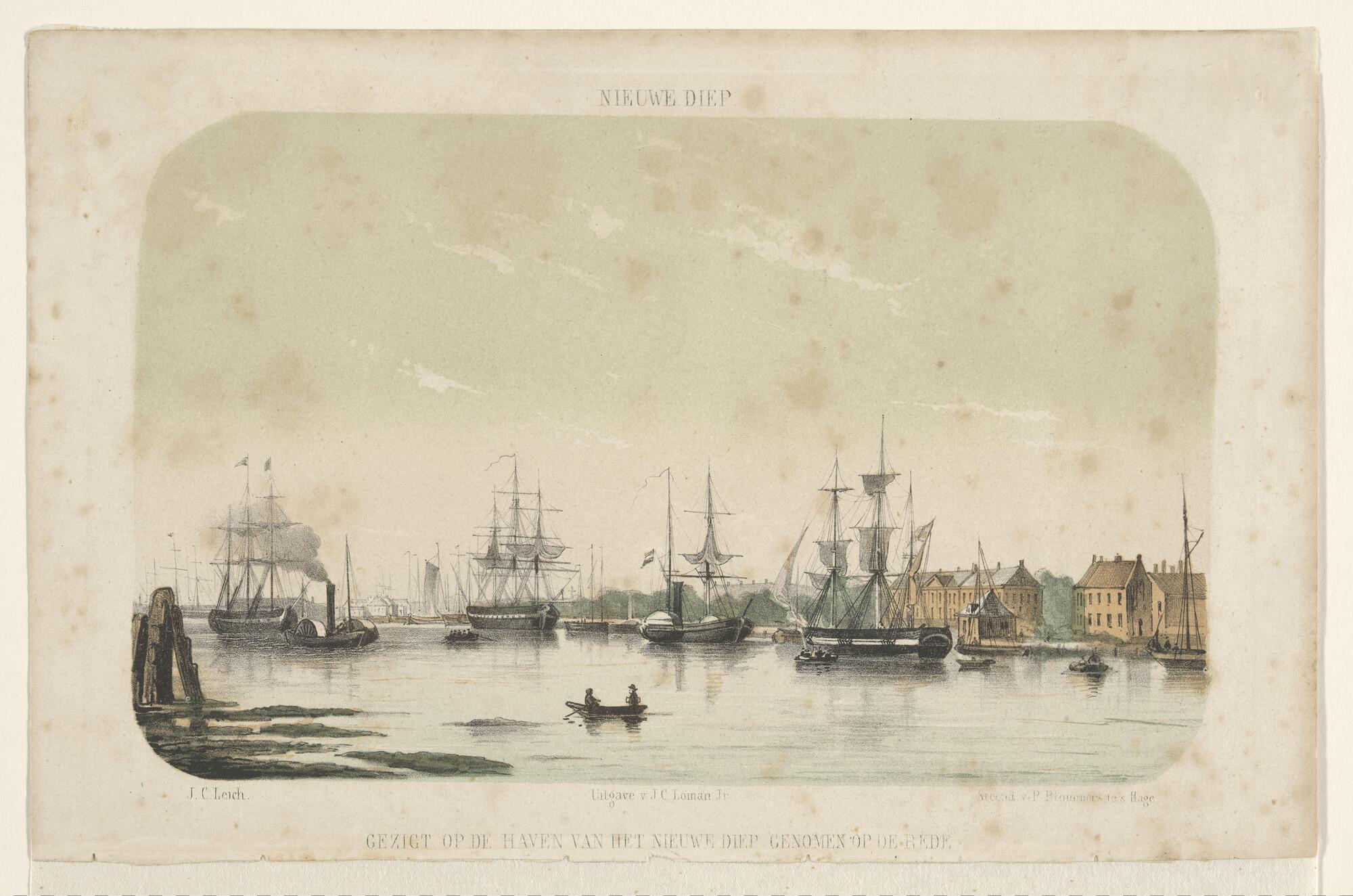 Lithografie van de haven van het Nieuwe Diep, met dr...