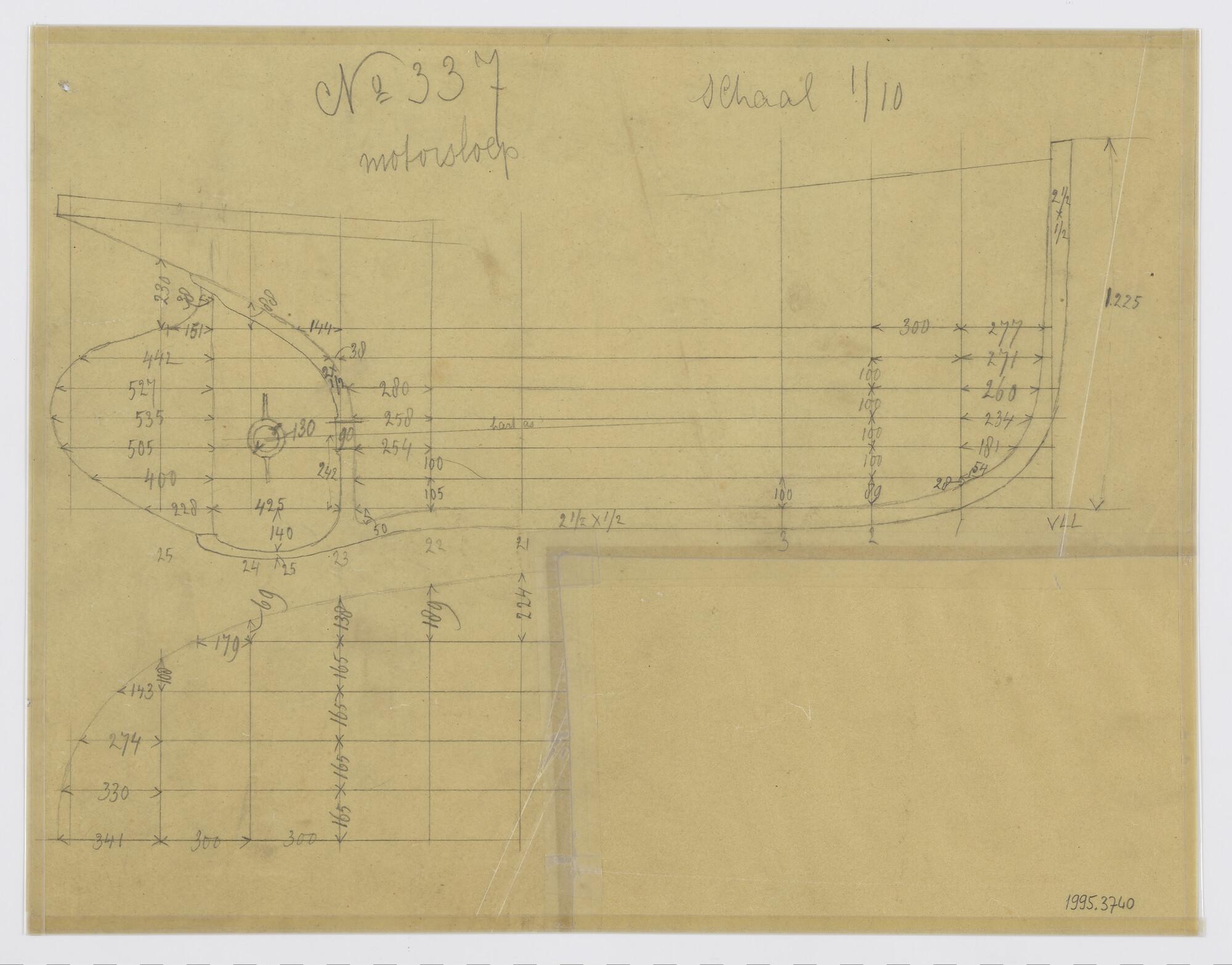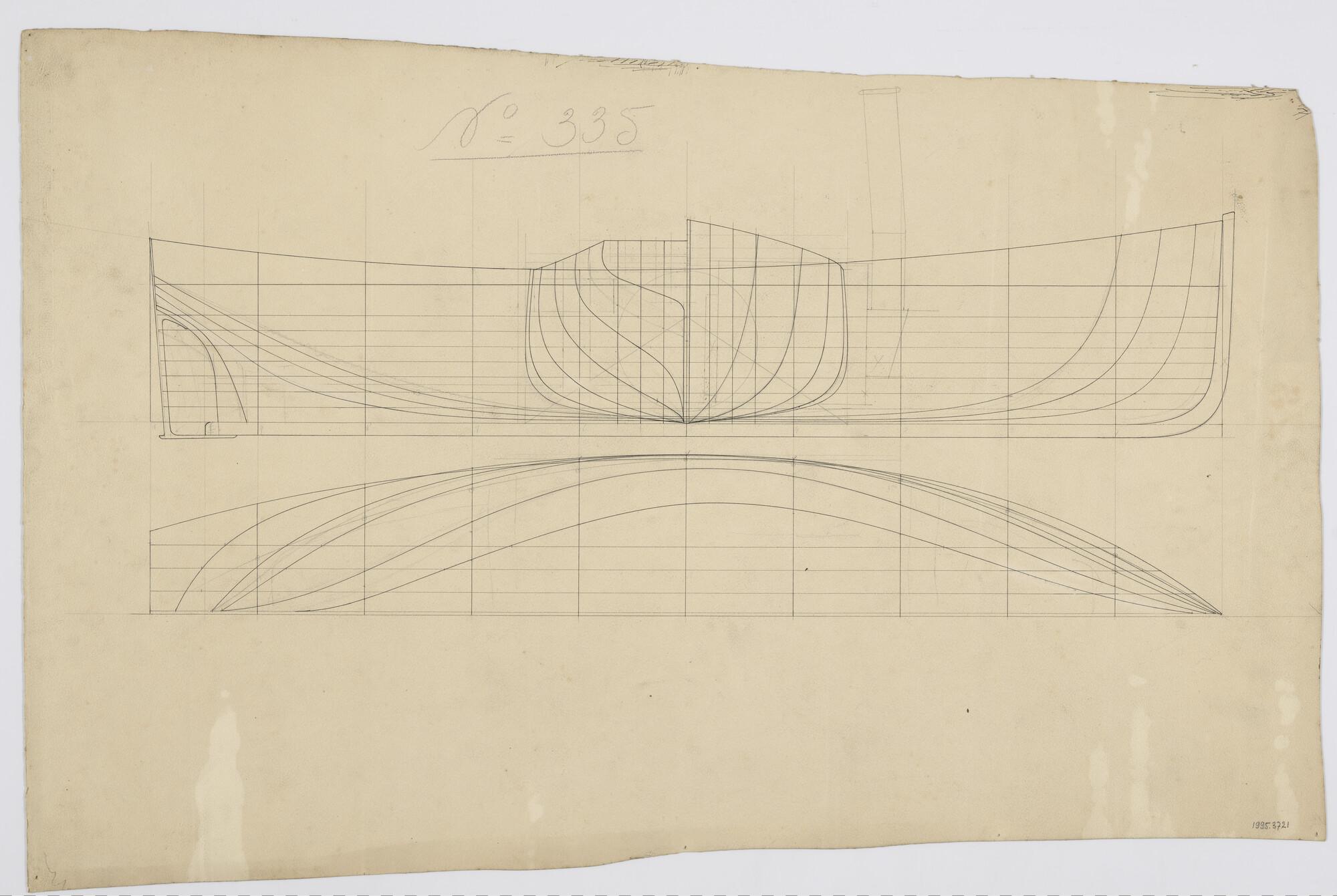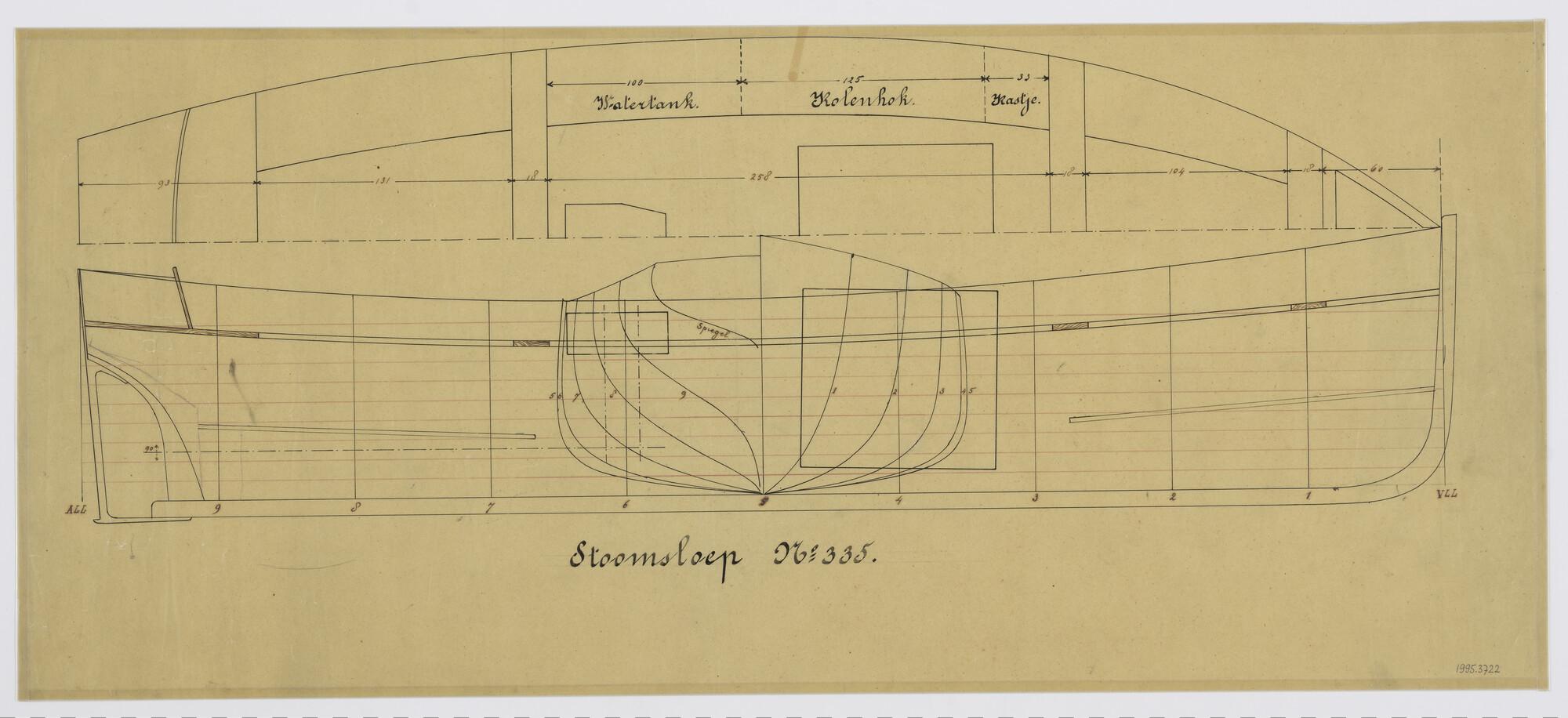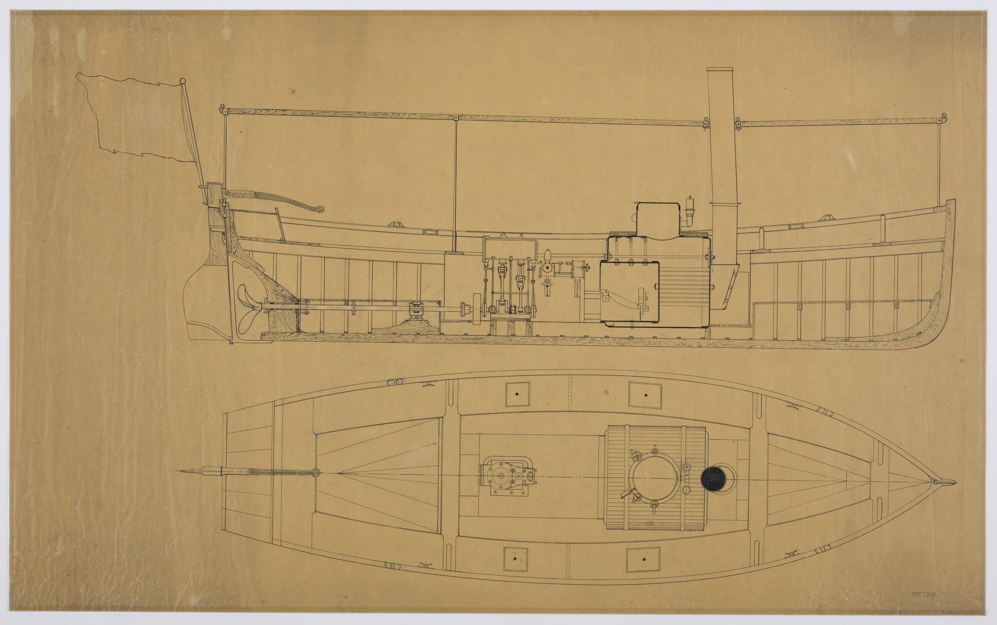 Waterlijnplan en doorsnede met motor van brandblusschip