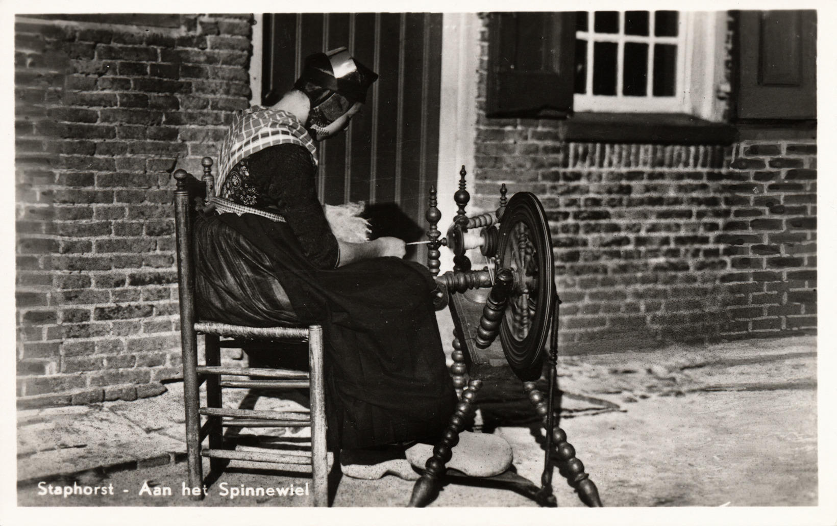 Lijsje Hoeve in Staphorster dracht achter het spinne...