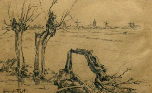 Potloodtekening. Knotwilgen aan de Vlaardingse Vaart...