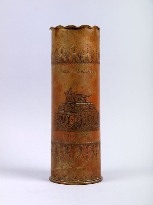 Bewerkte granaathuls als vaas met afbeelding van tan...