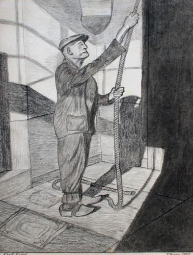 Potloodtekening. Klokkenluider Grote Kerk Vlaardingen.