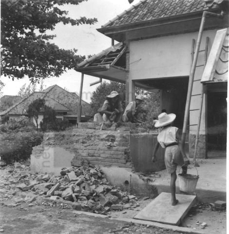 Herstelwerkzaamheden aan een koloniaal gebouw, Indon...