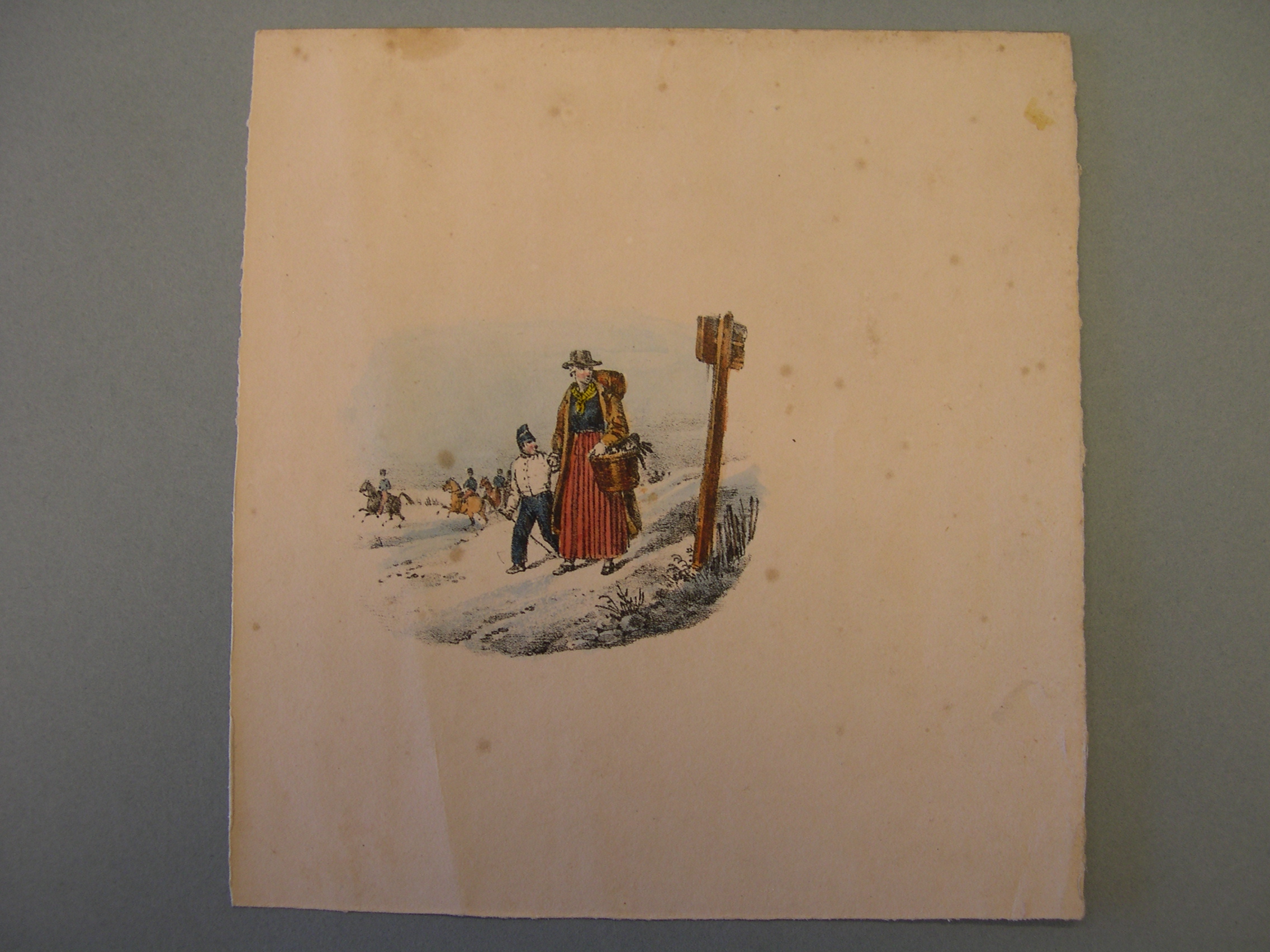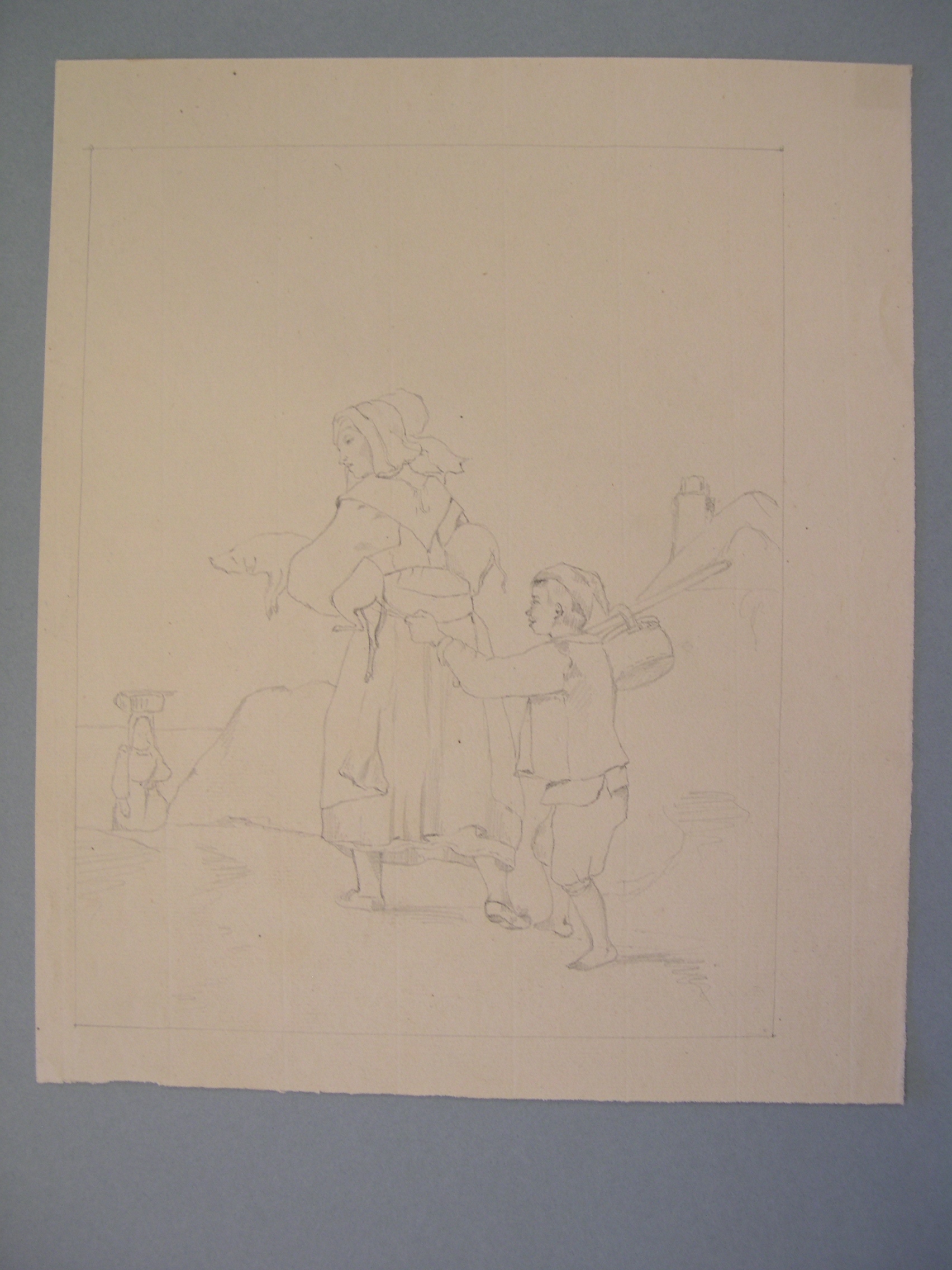 Tekening van een landschap met vrouw en zoon