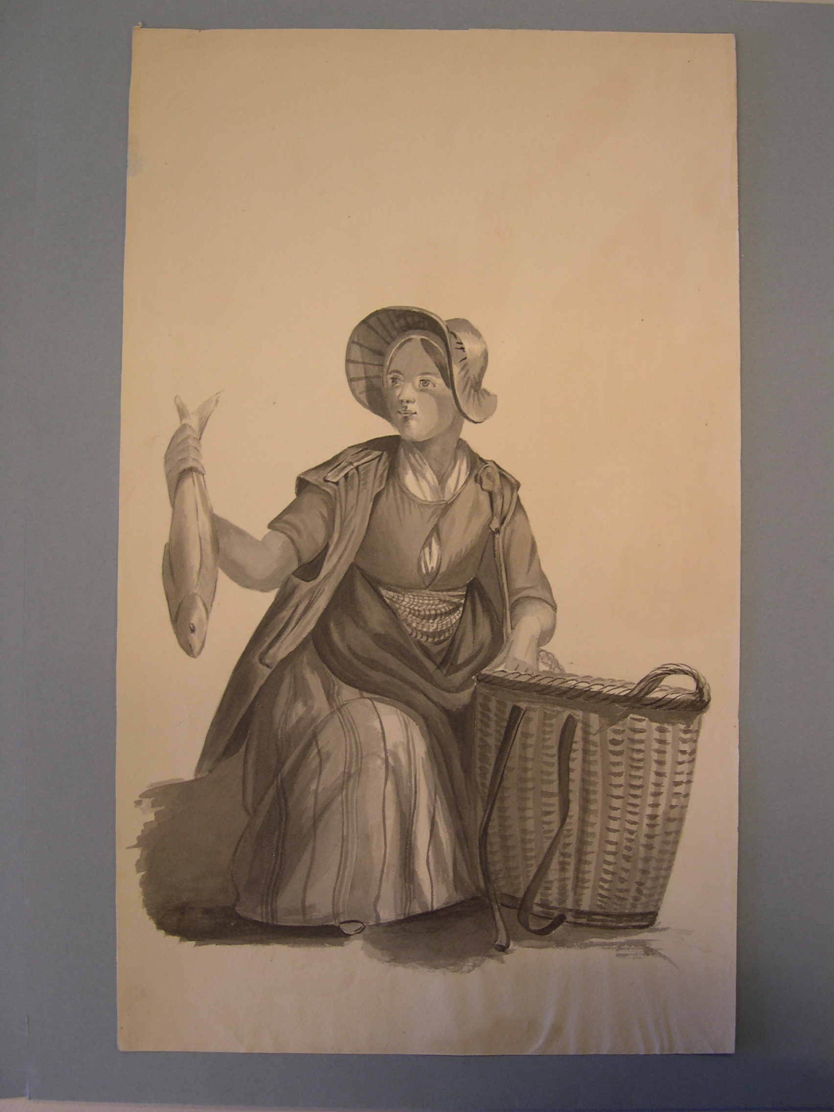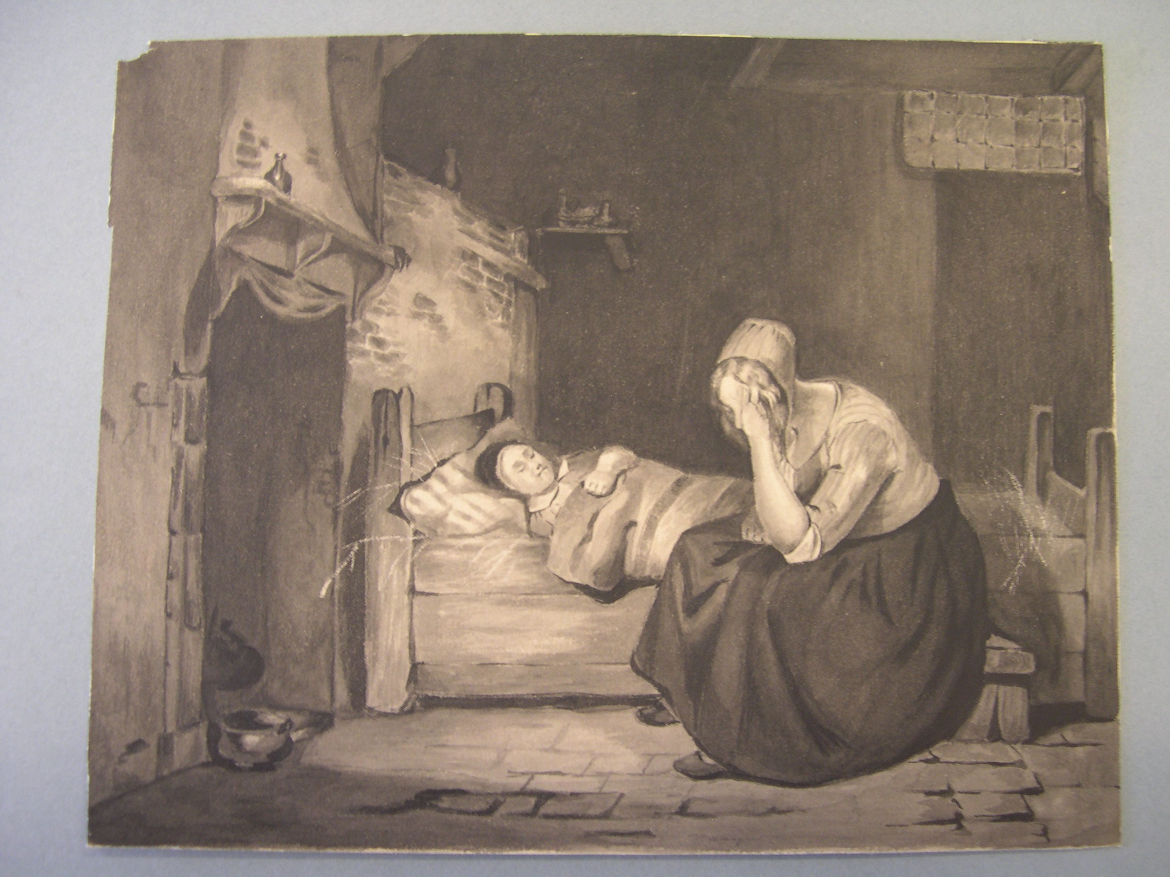Zittend weesmeisje met naaiwerk