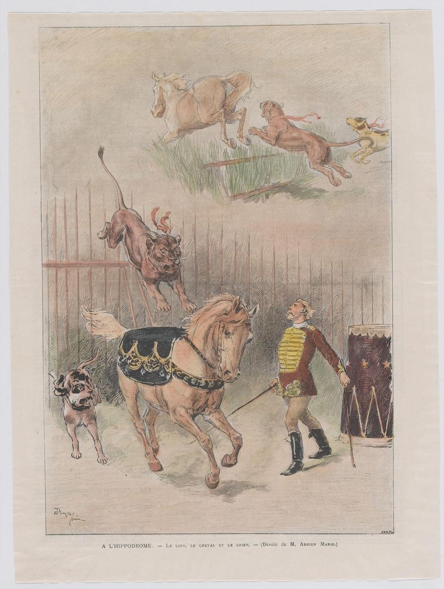 Dresseur met paard, leeuw en hond