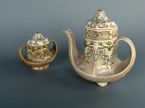 Art Nouveau koffiepot met filter en suikerpot, Fayen...