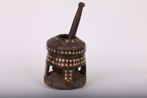 Houten vijzel, ingelegd met been en koper