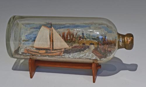 Scheepsmodel in fles op houten standaard