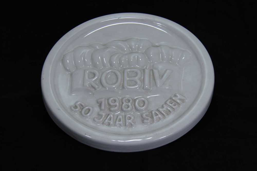 Jubileumplaat van aardewerk voor 50 jaar Robiv uit 1980