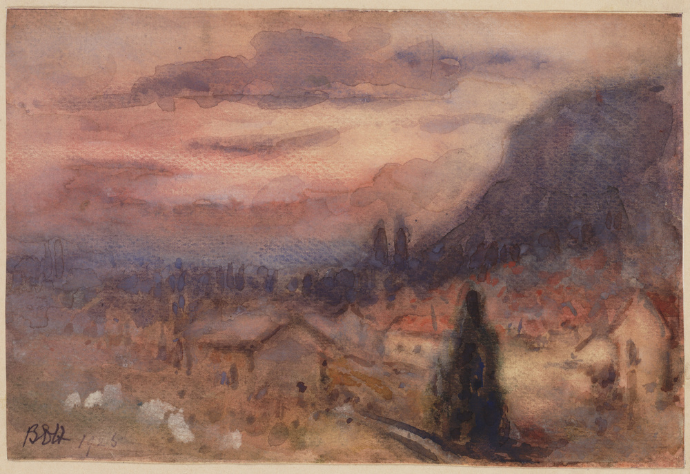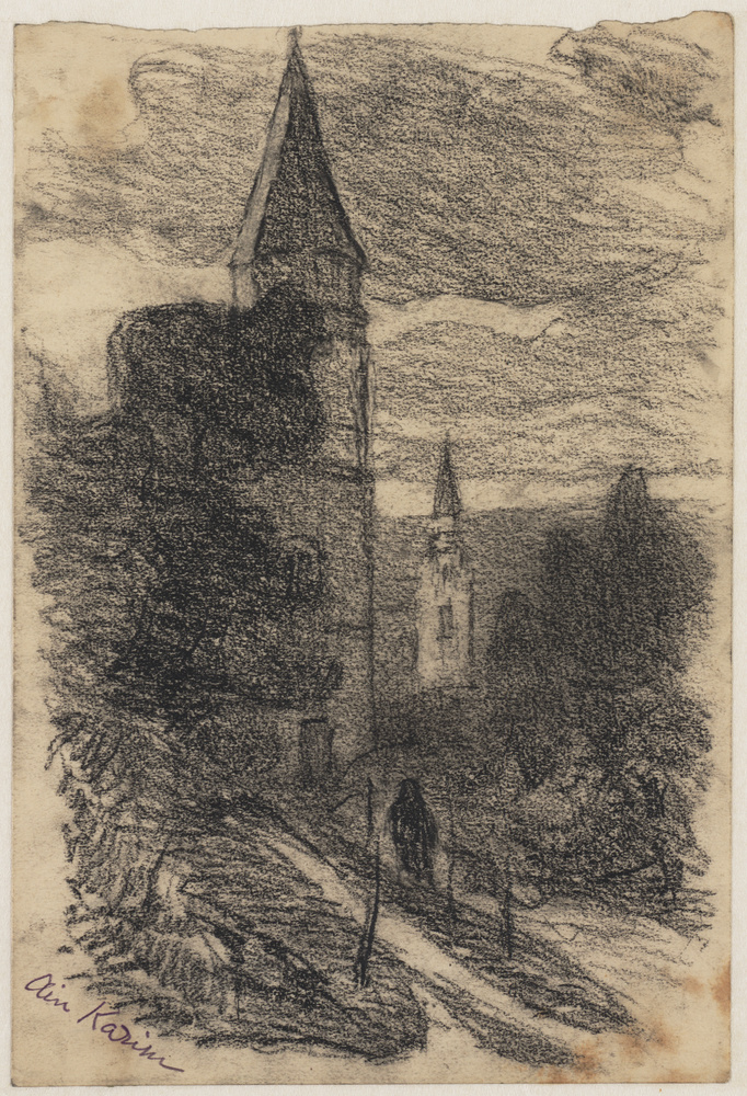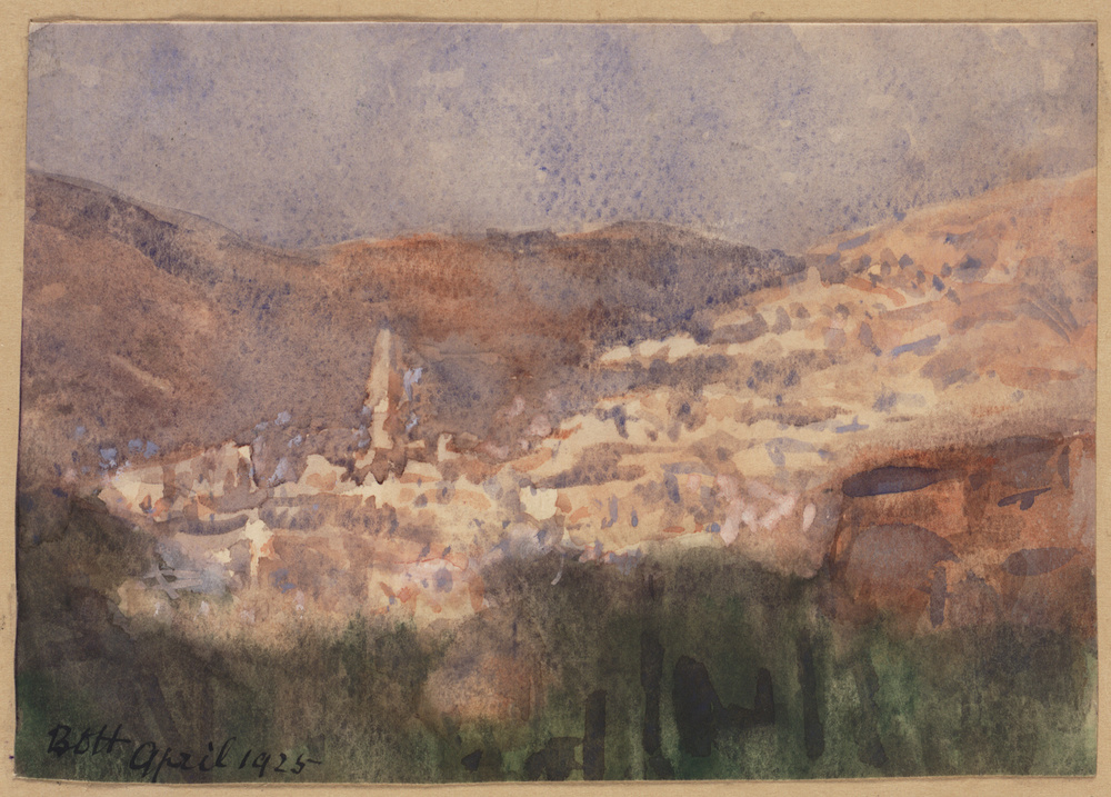 Gezicht op de hoek van een pleintje met twee bogen, ...