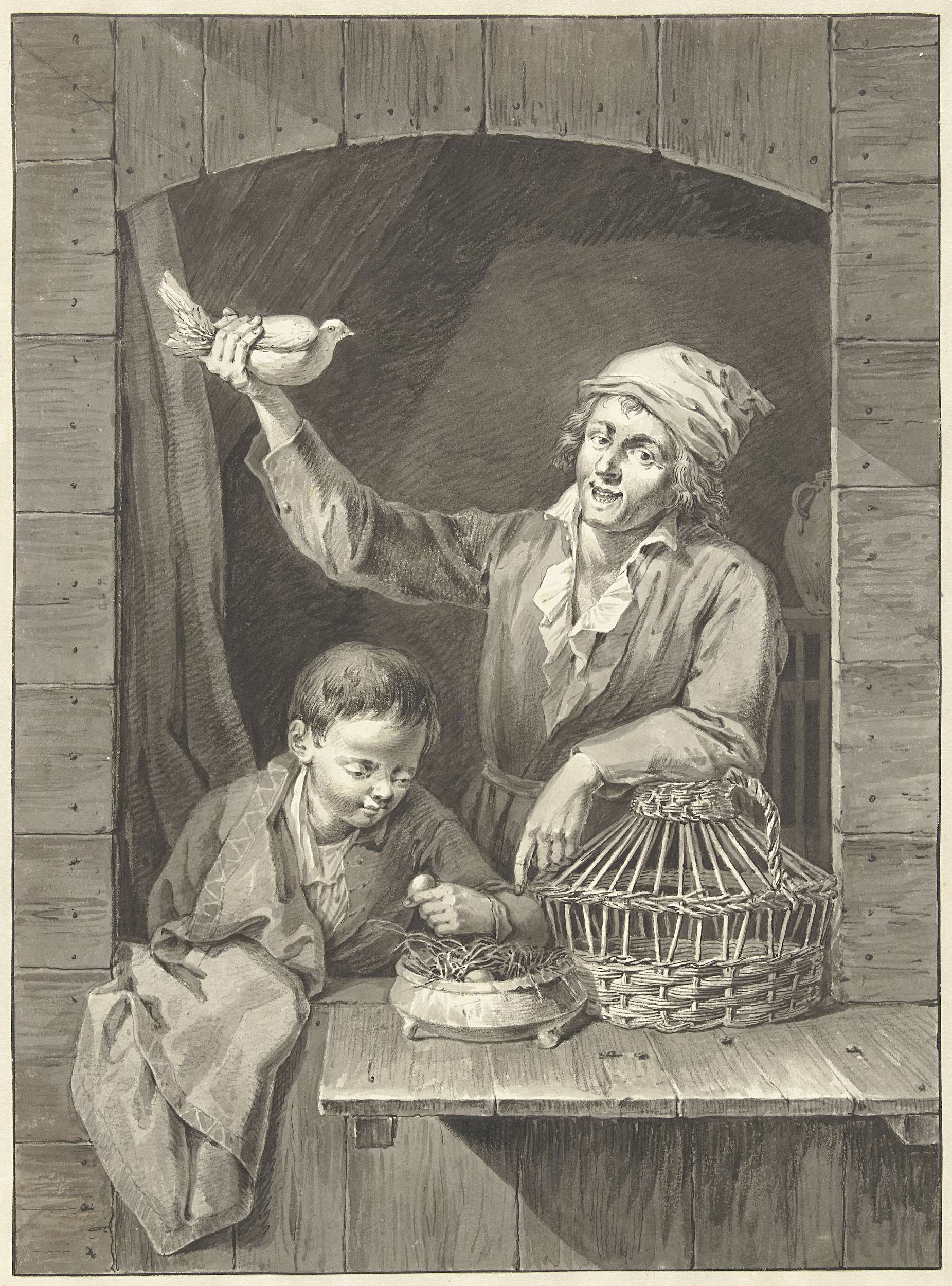 Man en jongen in venster met duif en eieren