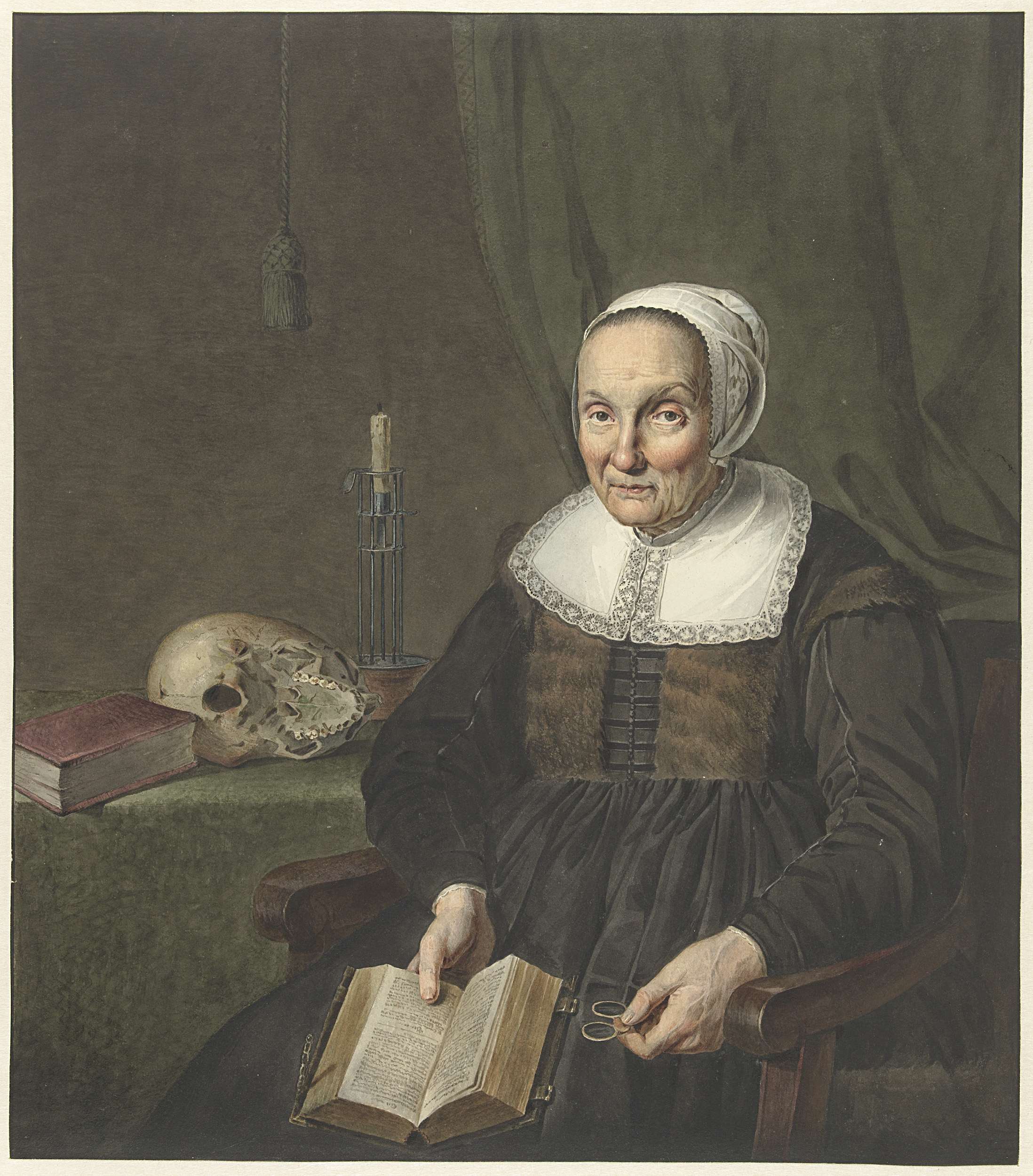 Portret van een zittende oude vrouw met opengeslagen...