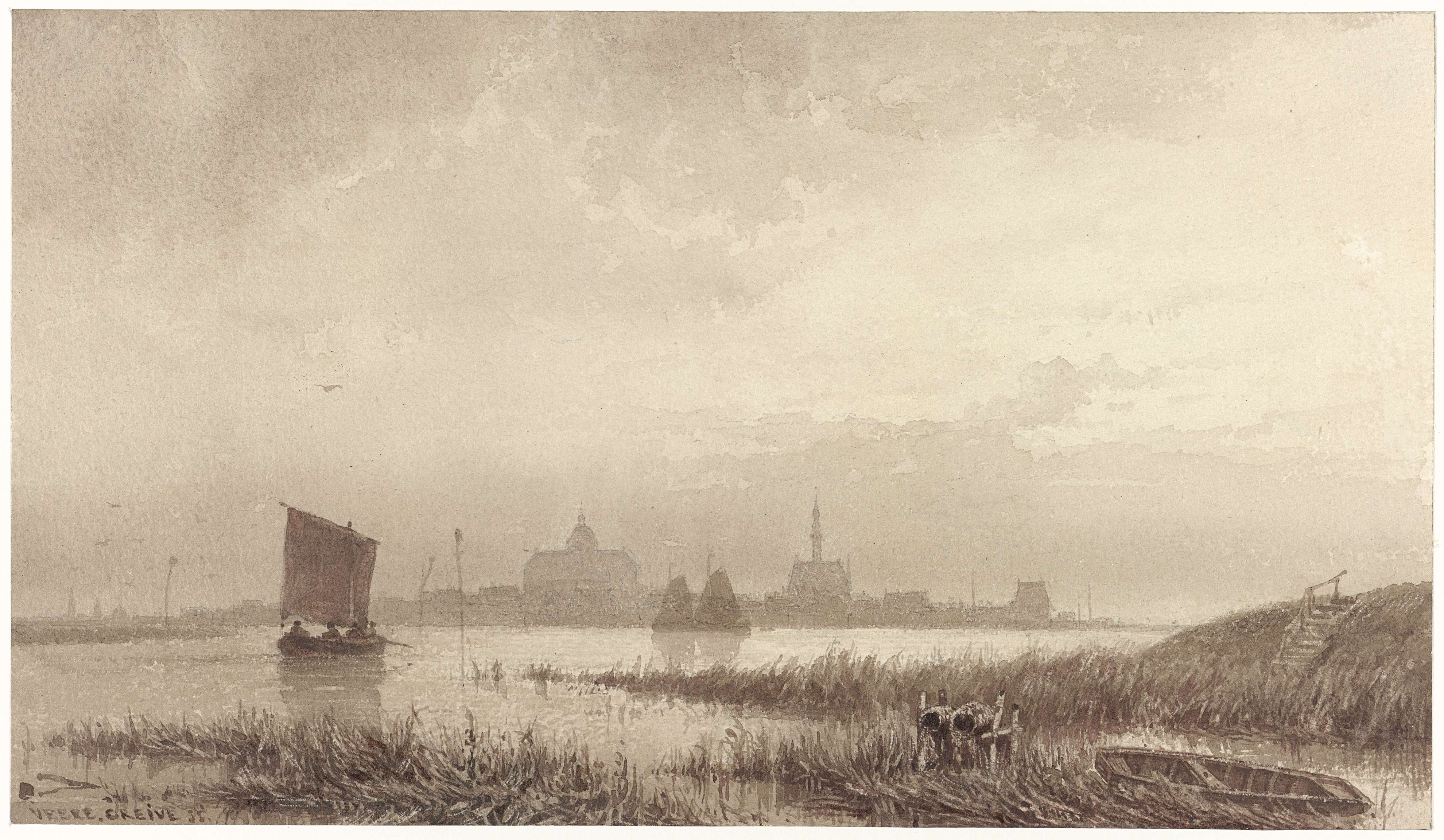 Landschap met enkele figuren aan het water