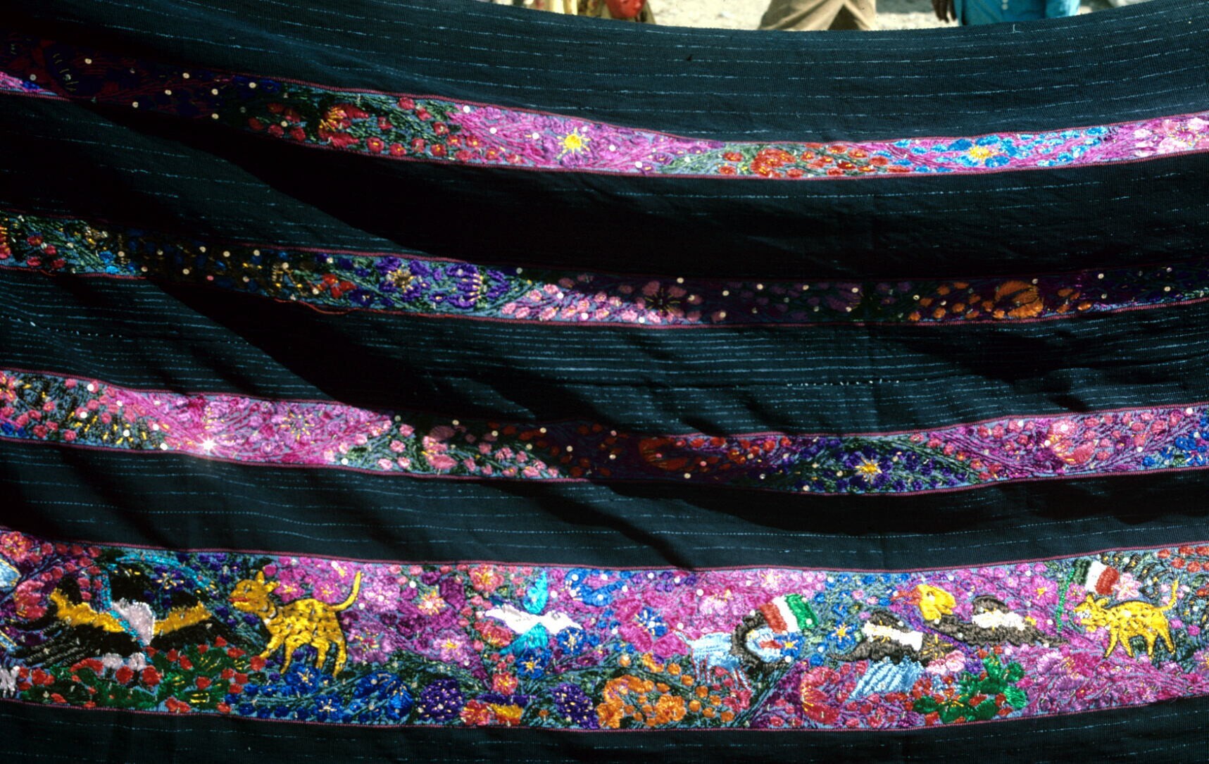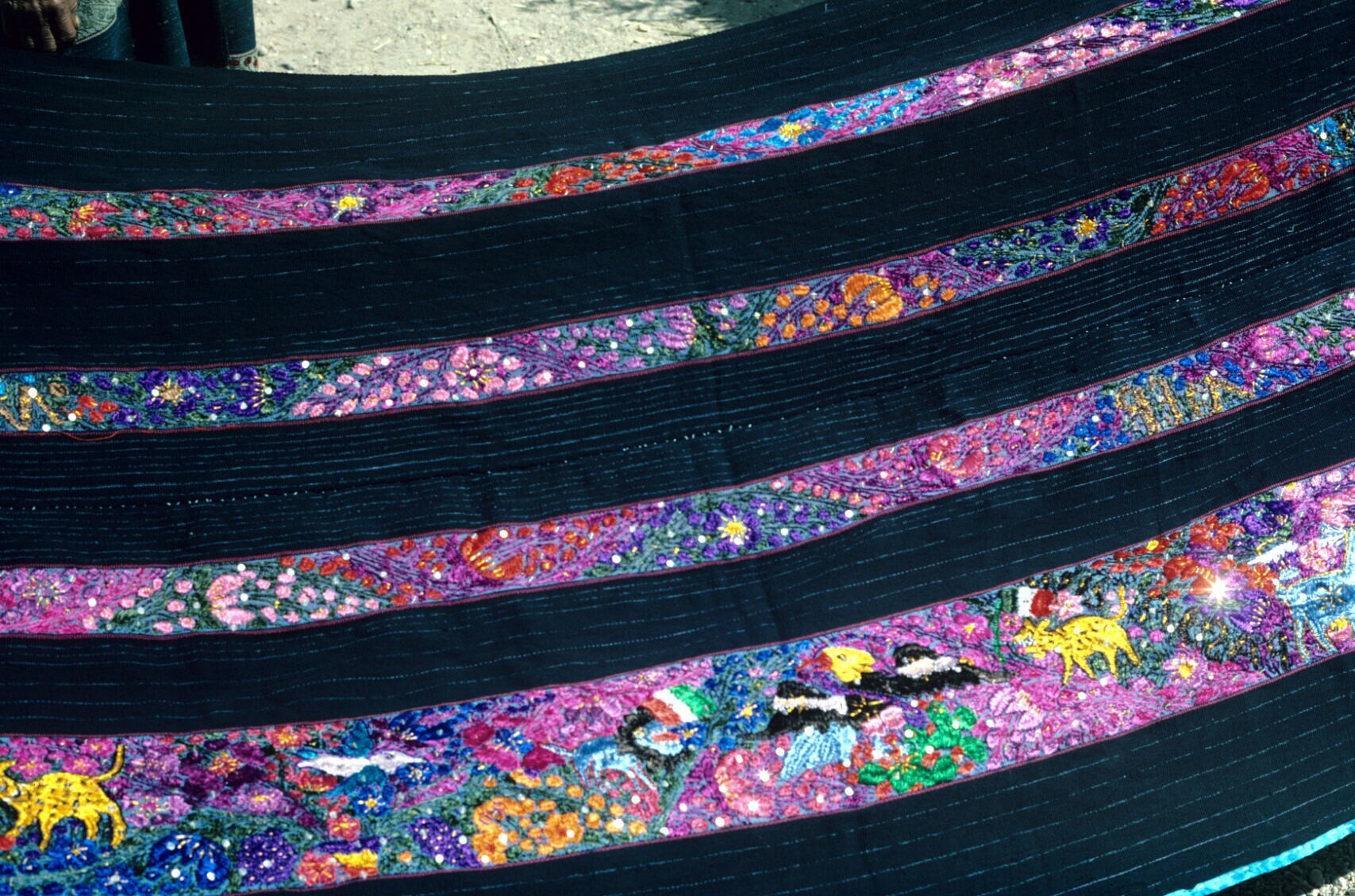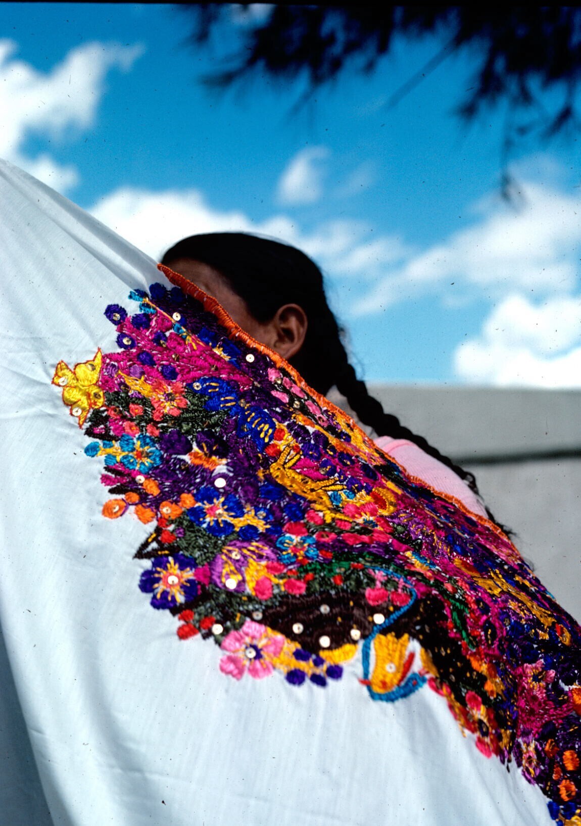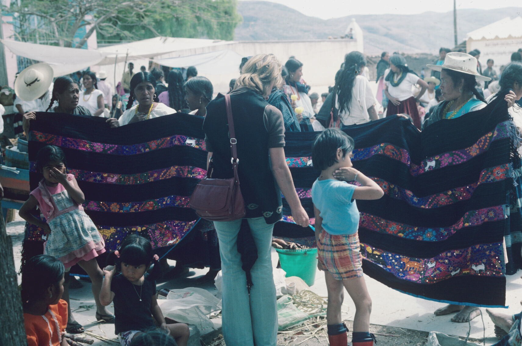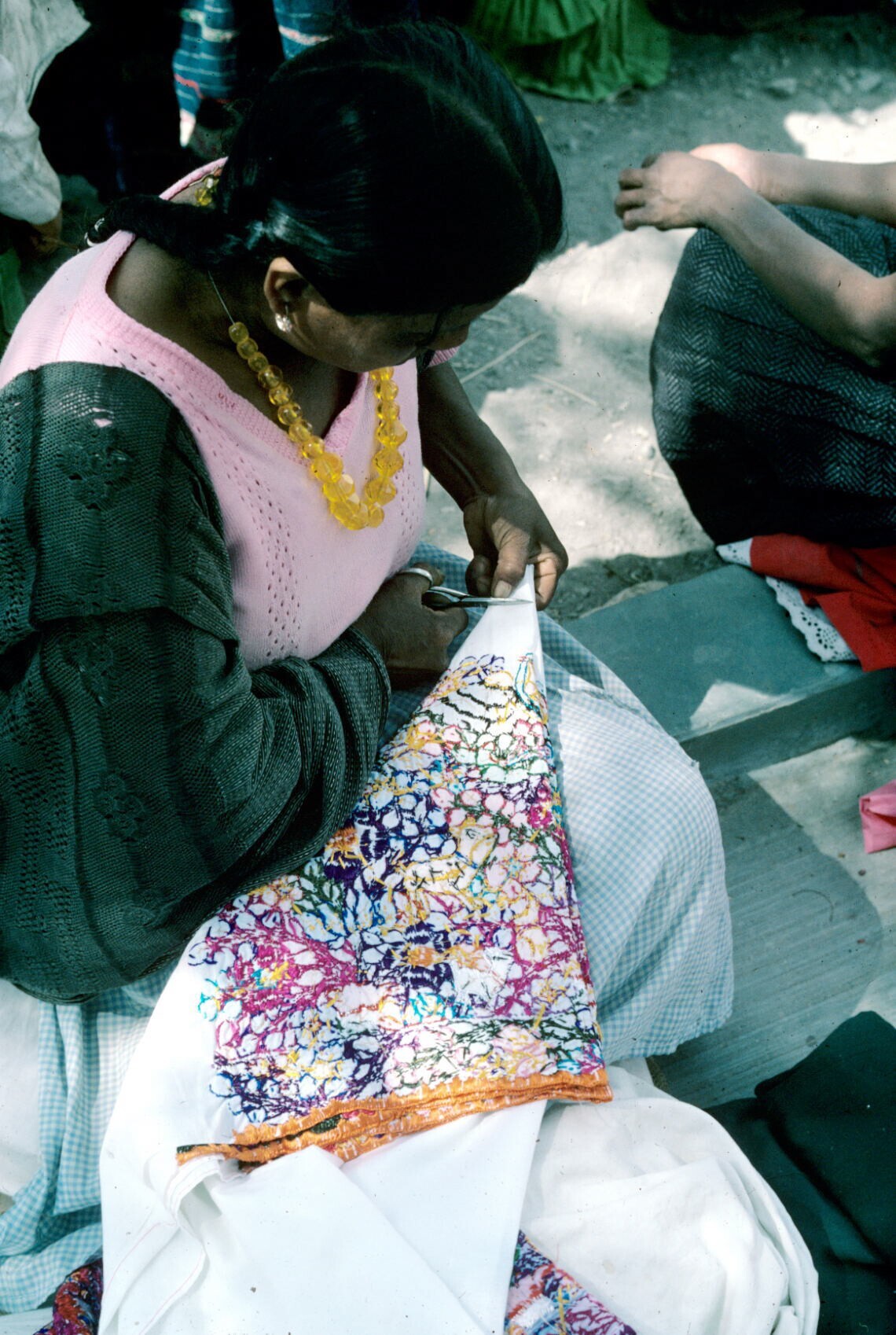 vrouw met kleurig geborduurde omslagdoek op markt