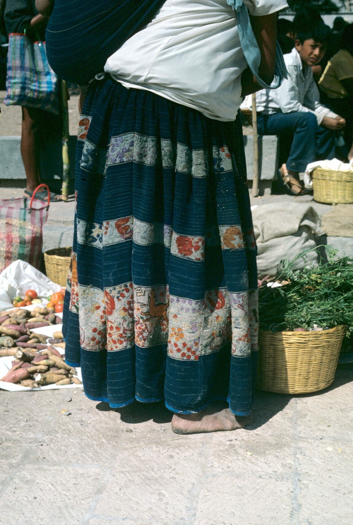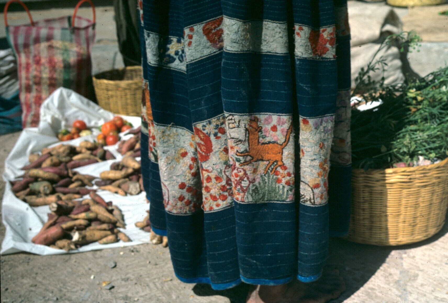 groenten op markt, op voorgrond rok van vrouw in lok...