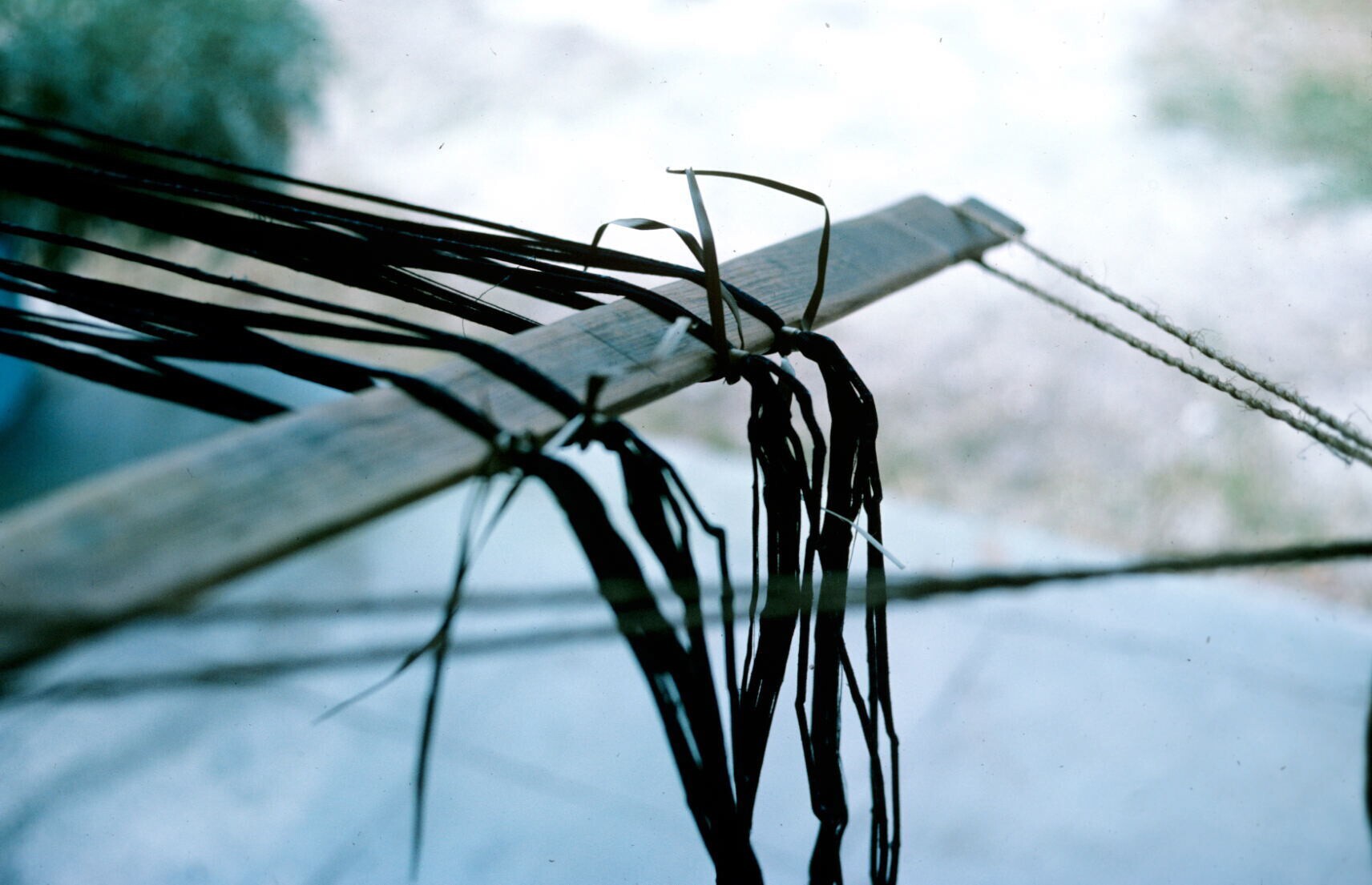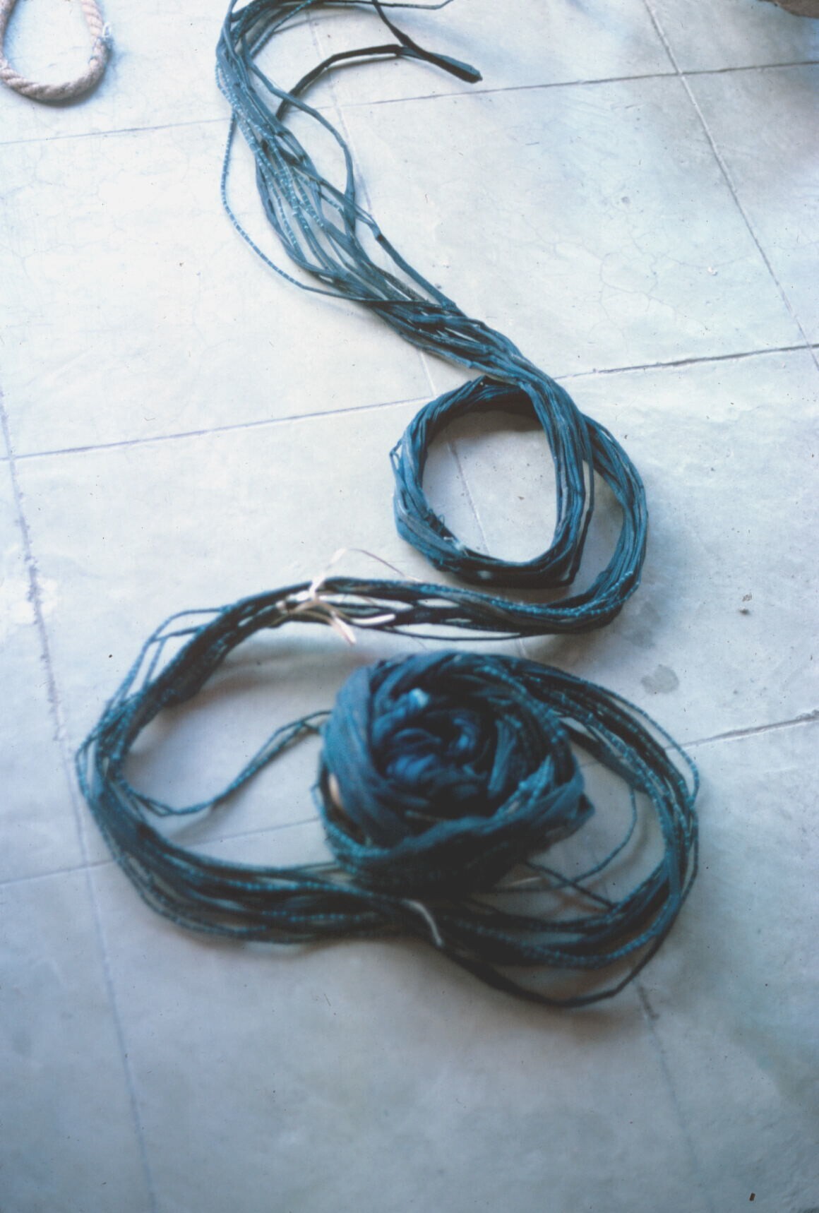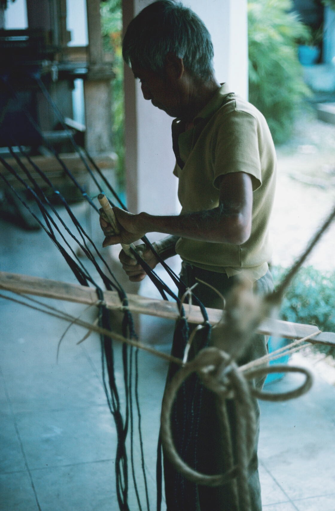 man met bundels geverfde garens