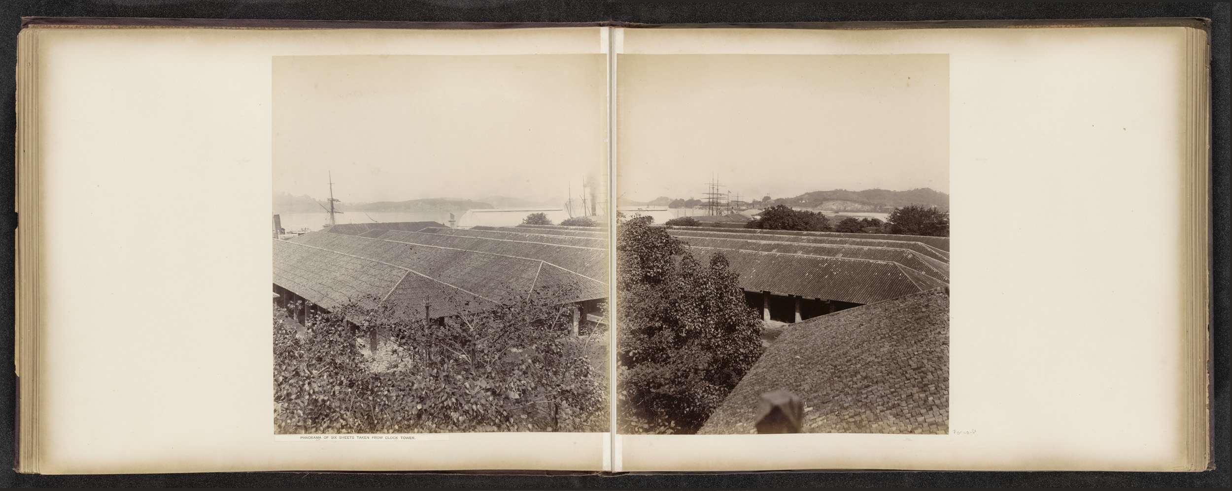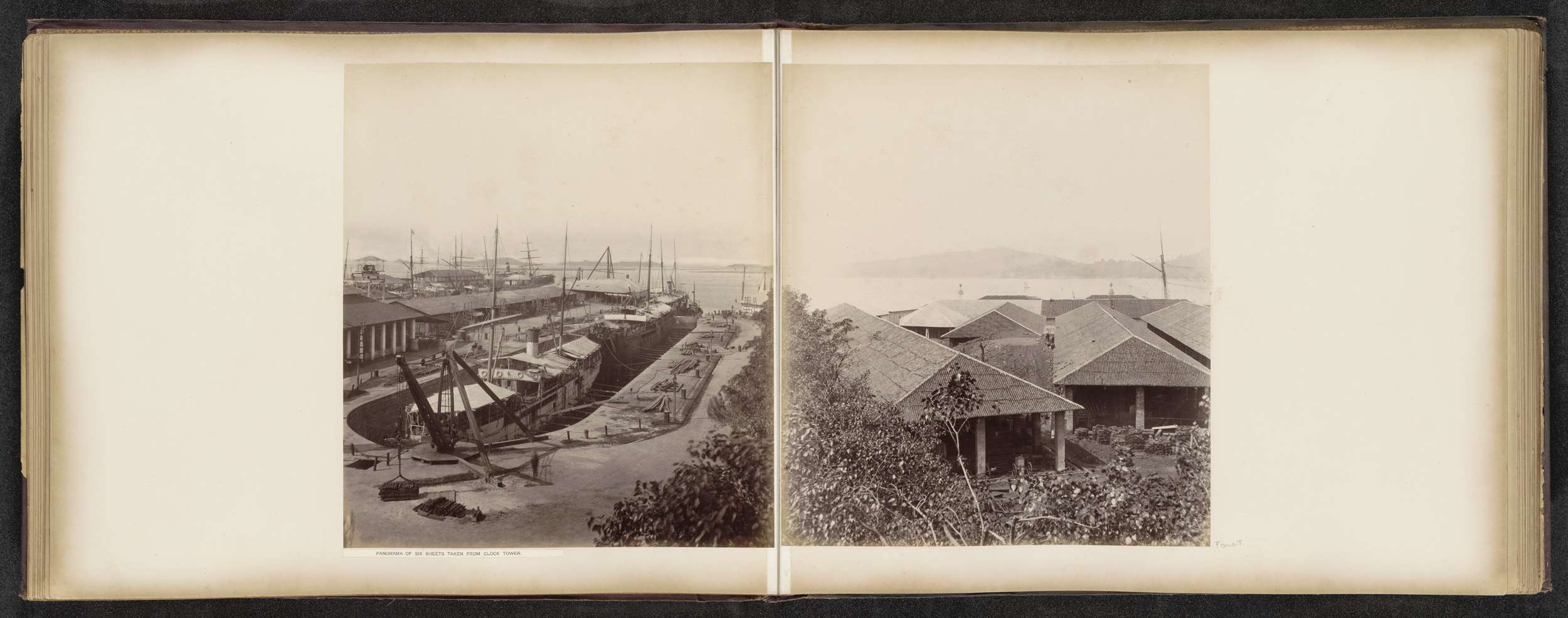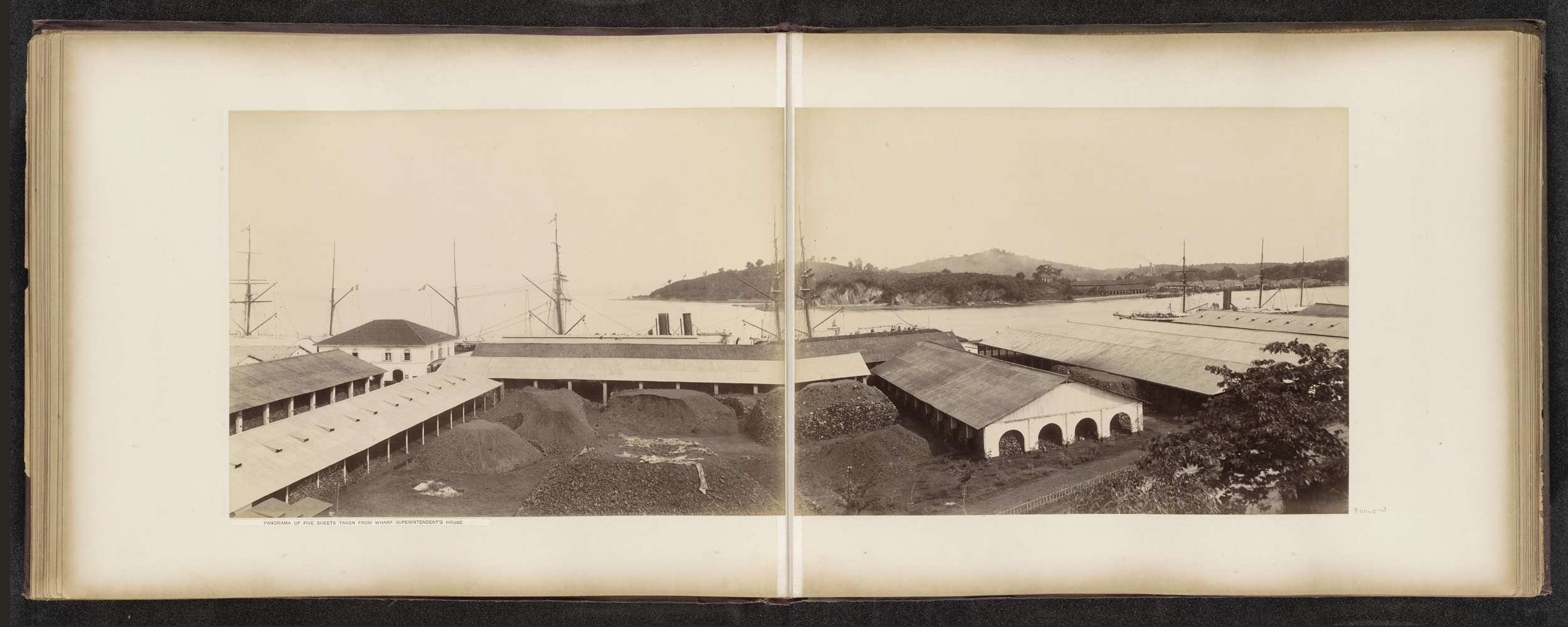 Gezicht op de gebouwen en dokken van de Tanjong Paga...