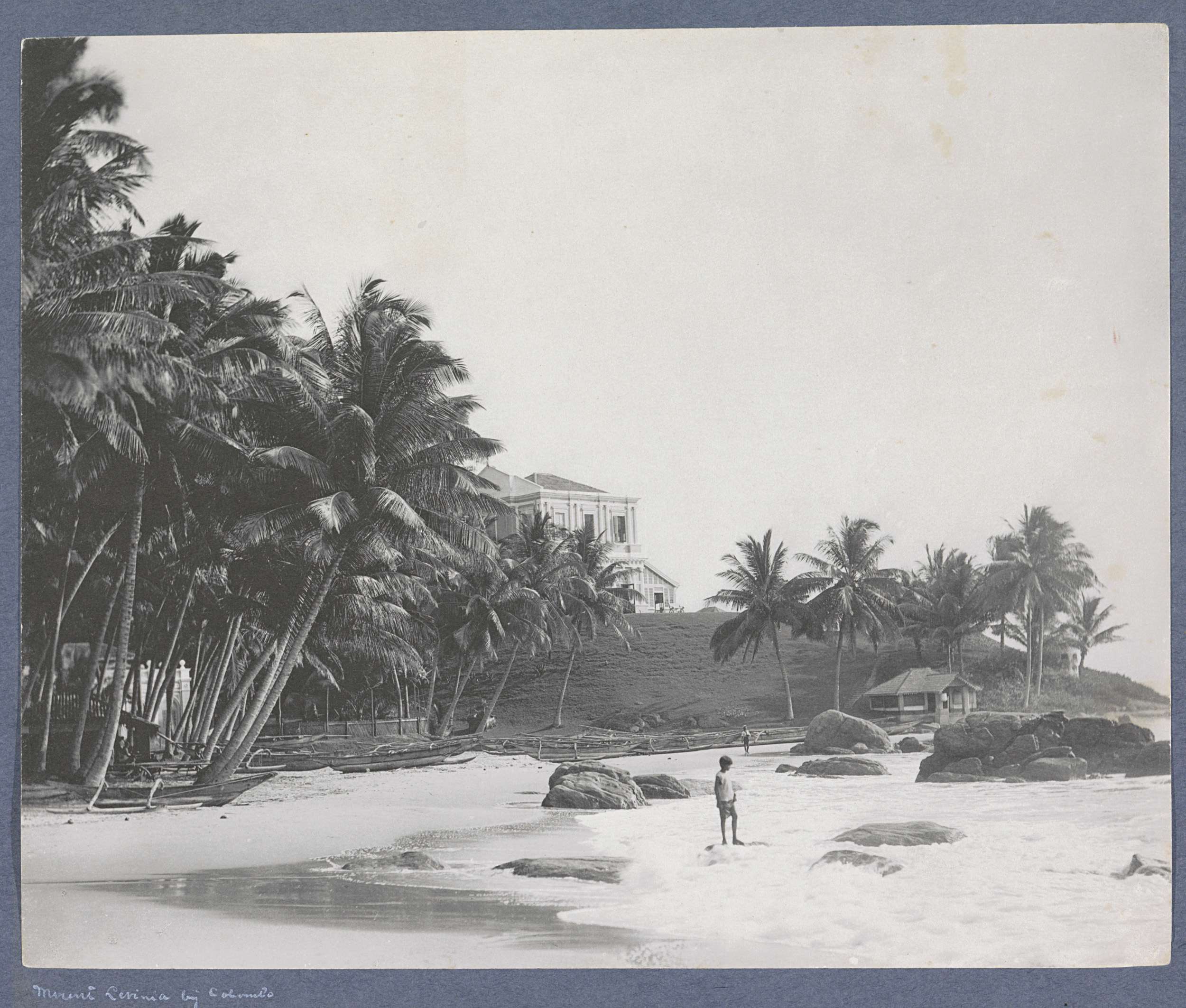 Strand bij Mount Lavinia (Colombo) met palmen, villa...