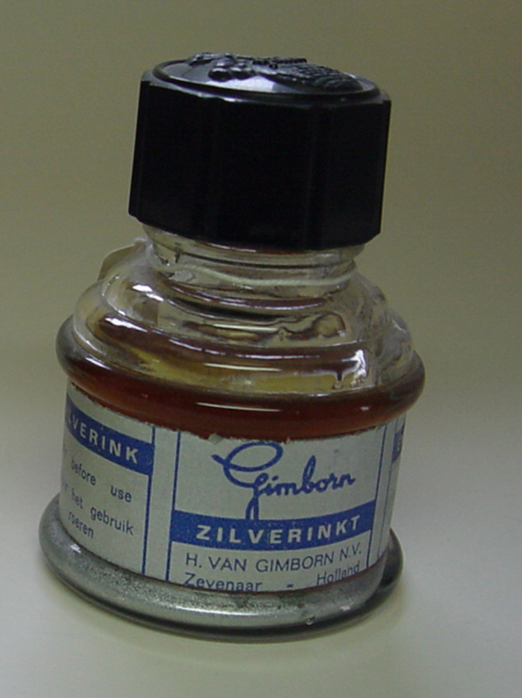 Inktfles van glas gevuld met zilverinkt door H. van ...