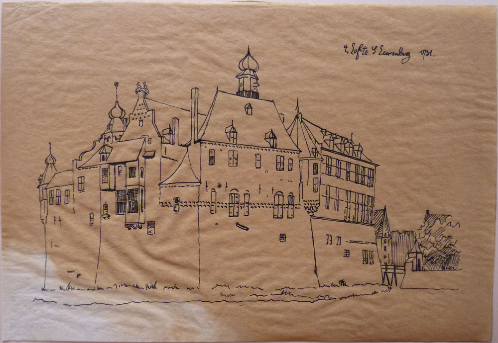 Tekening "Gezicht kasteel Bergh" papier, naar een te...