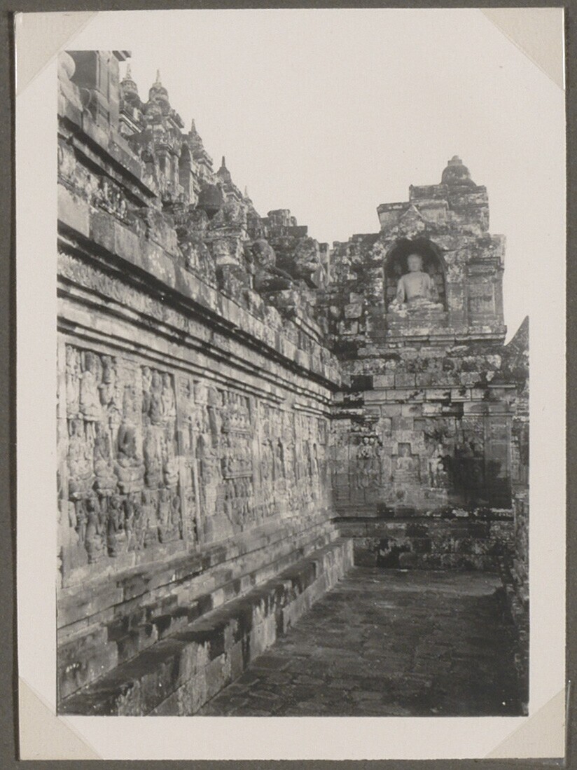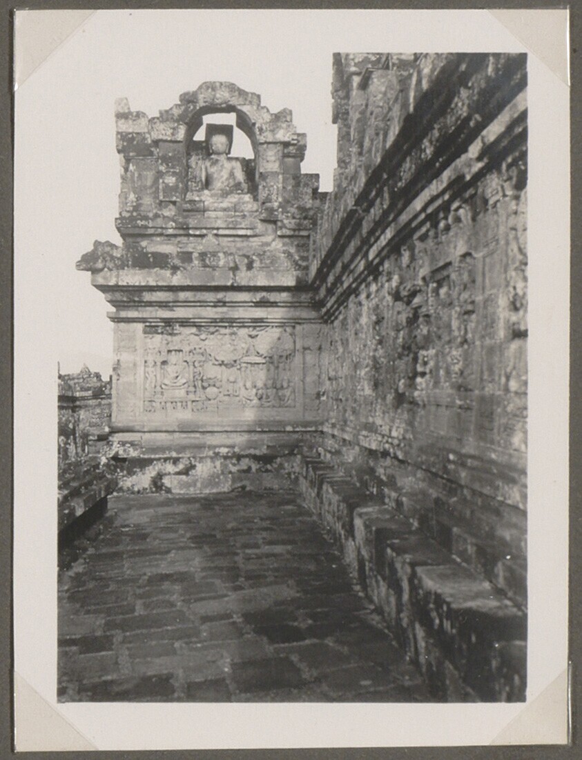 Een nis op de Burubudur met Buddha de beschermer