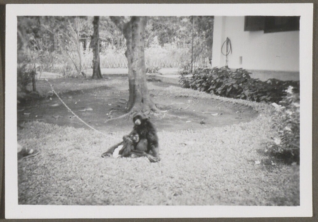Twee aangelijnde gibbons in een tuin