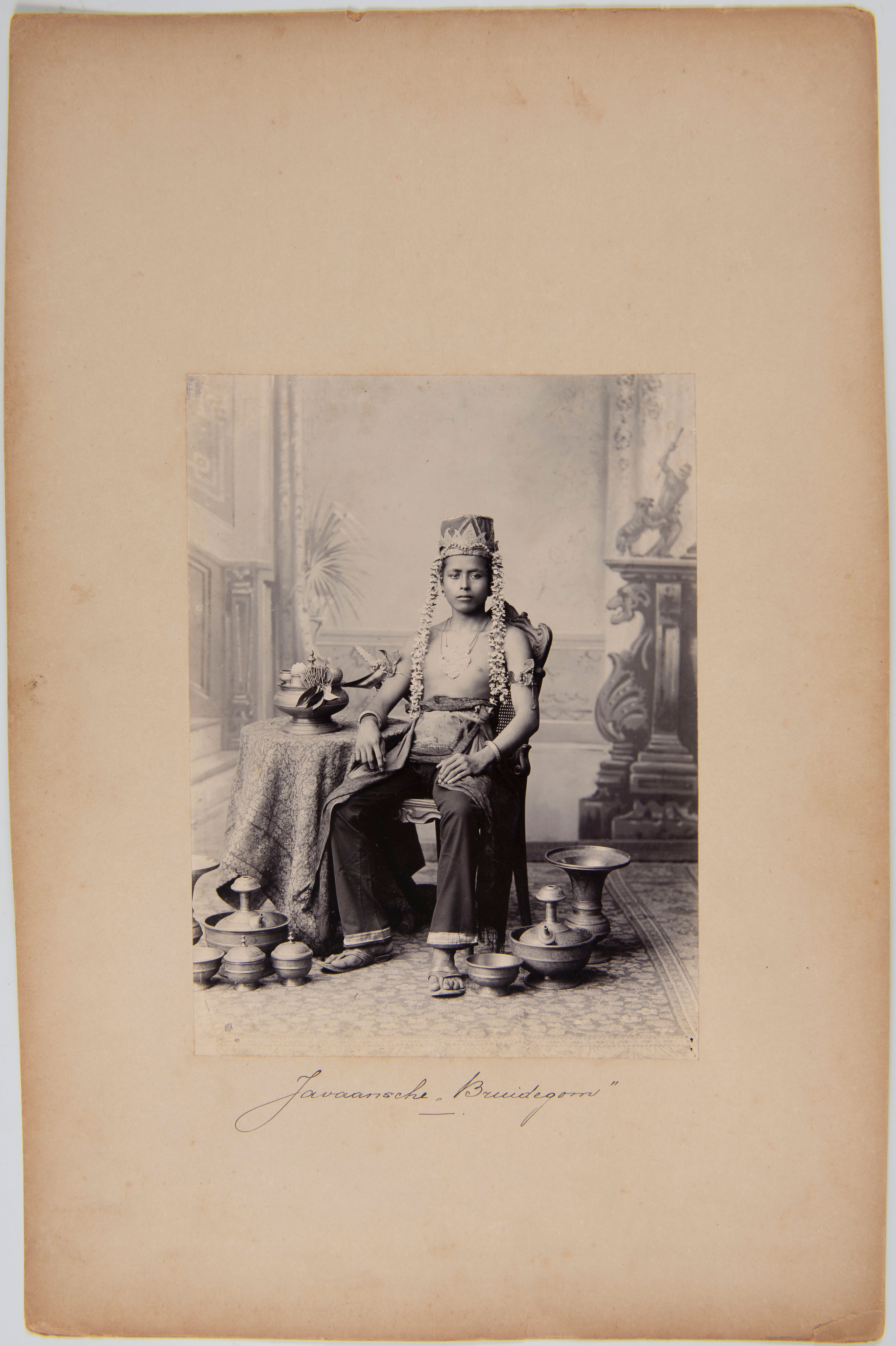 Studioportret van een Javaanse bruidegom temidden va...