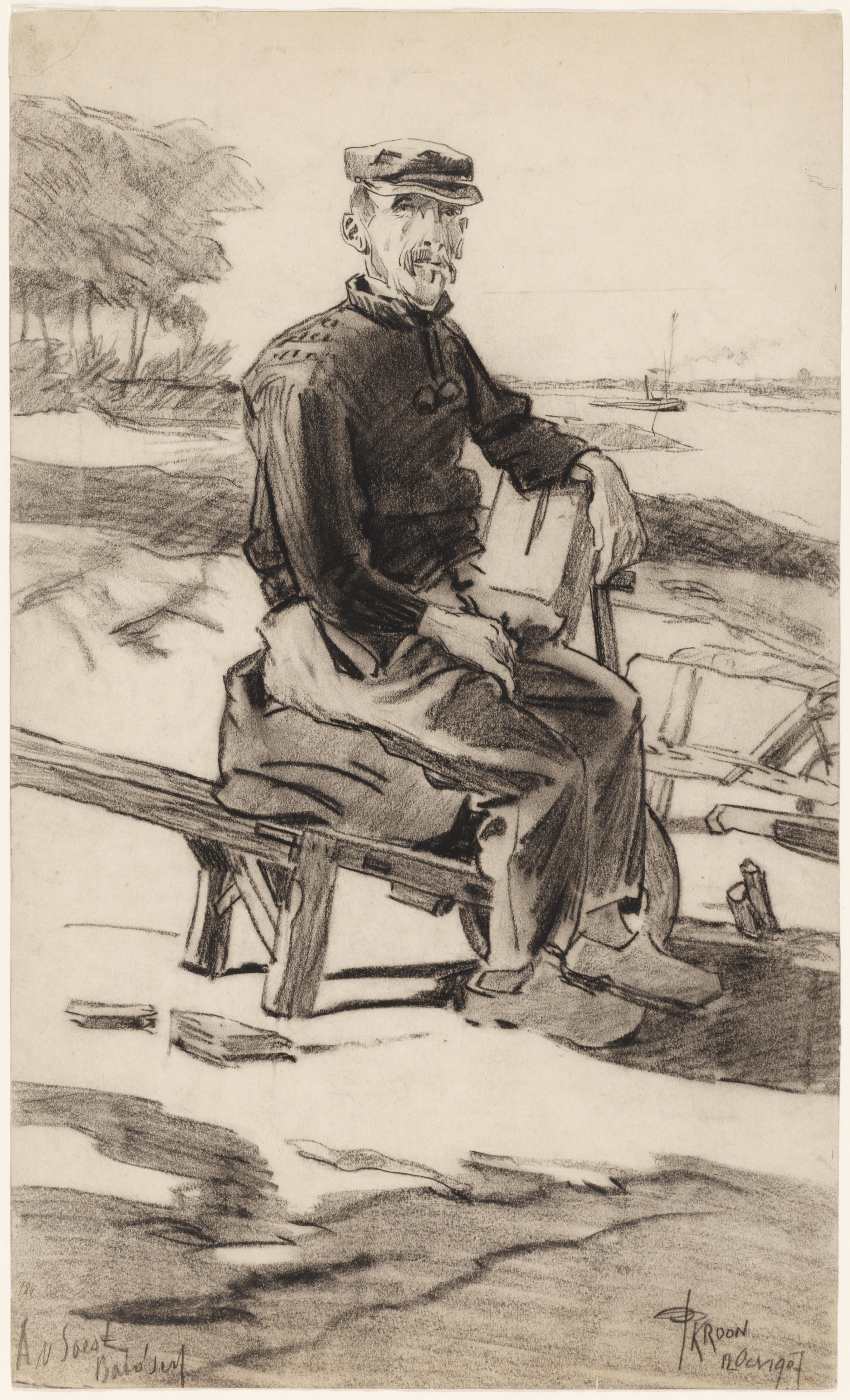 Man zittende op een kruiwagen, 1907
