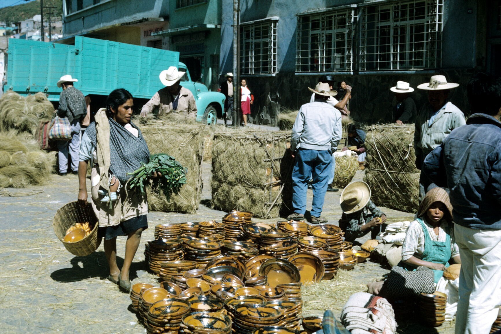 Trique vrouwen op markt; NB halve kalebas als hoofdd...