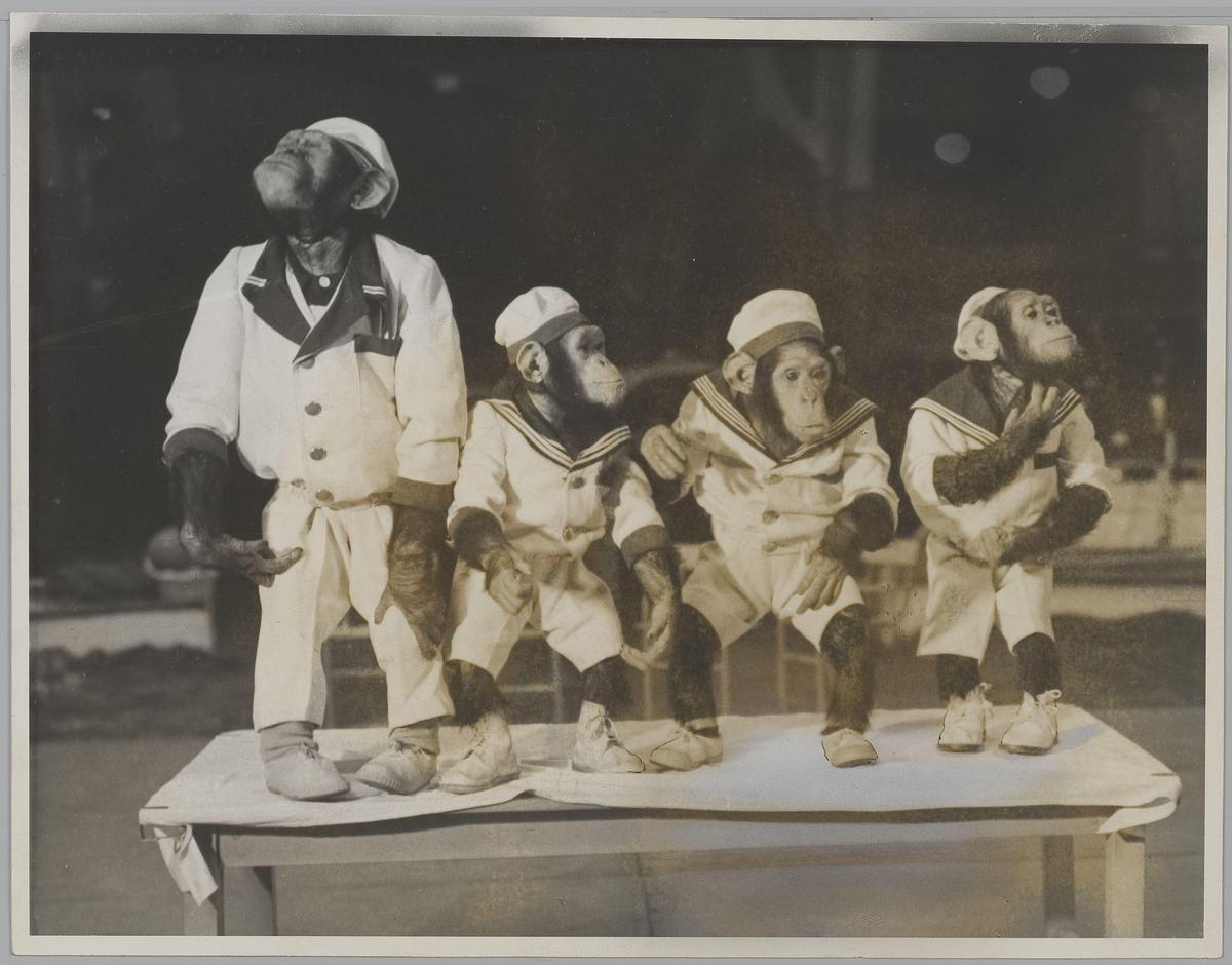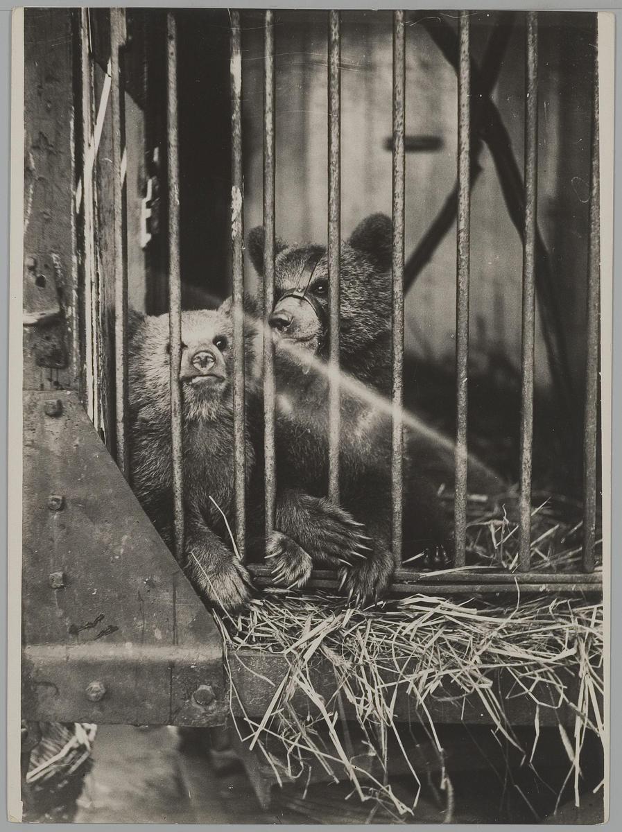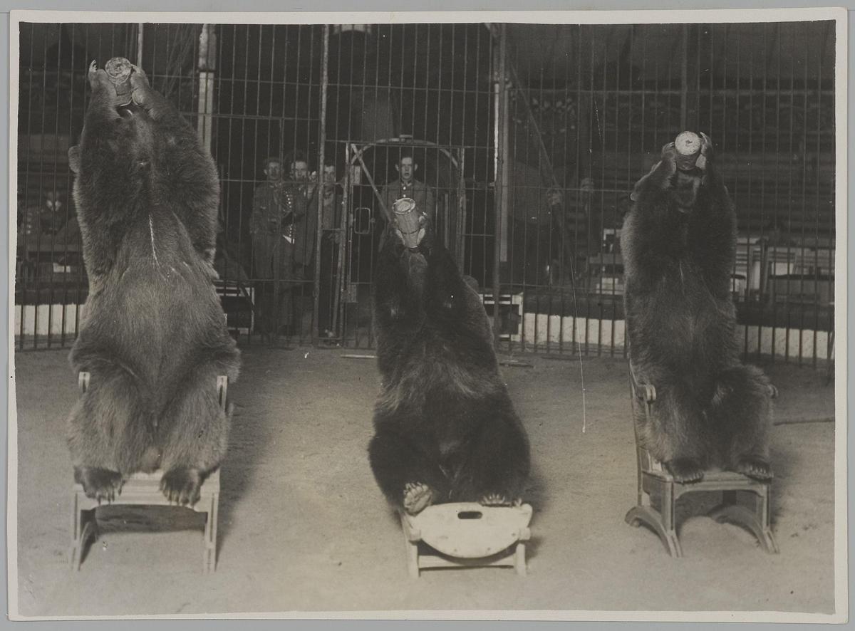 Circus Carl Hagenbeck, 3 flesje drinkende bruine ber...