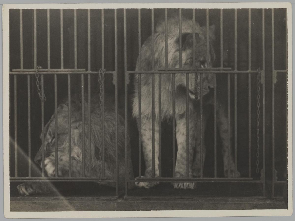 Circus Carl Hagenbeck, twee jonge leeuwen in kooiwag...