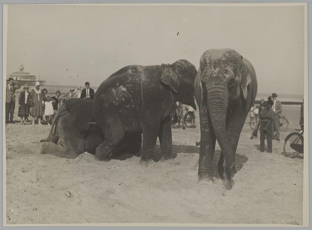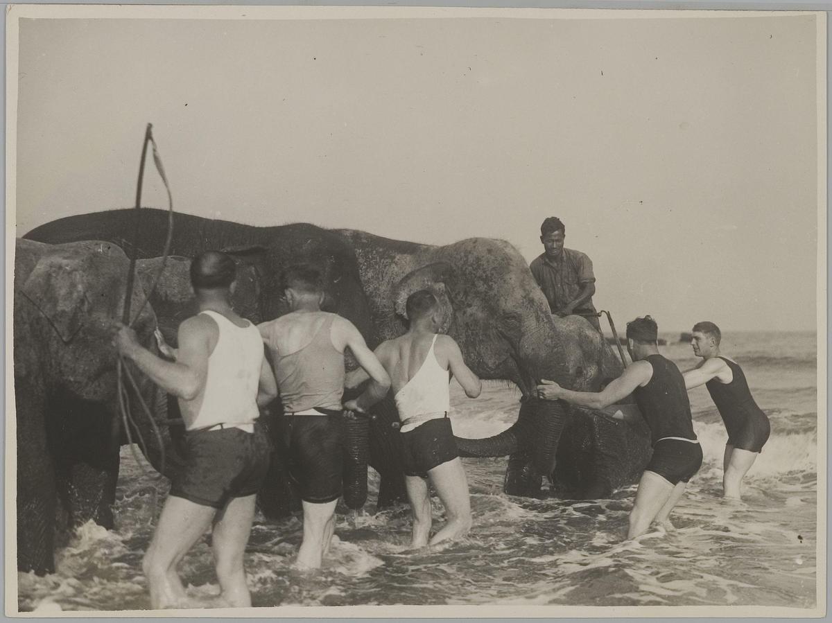 Circus Carl Hagenbeck, olifanten op het strand. Sche...