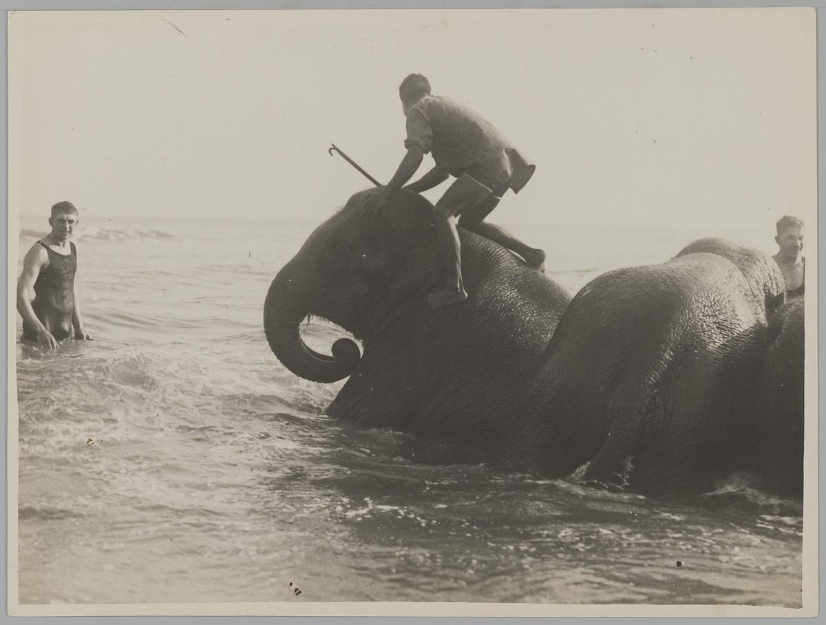 Circus Carl Hagenbeck. Olifanten baden in de Noordze...