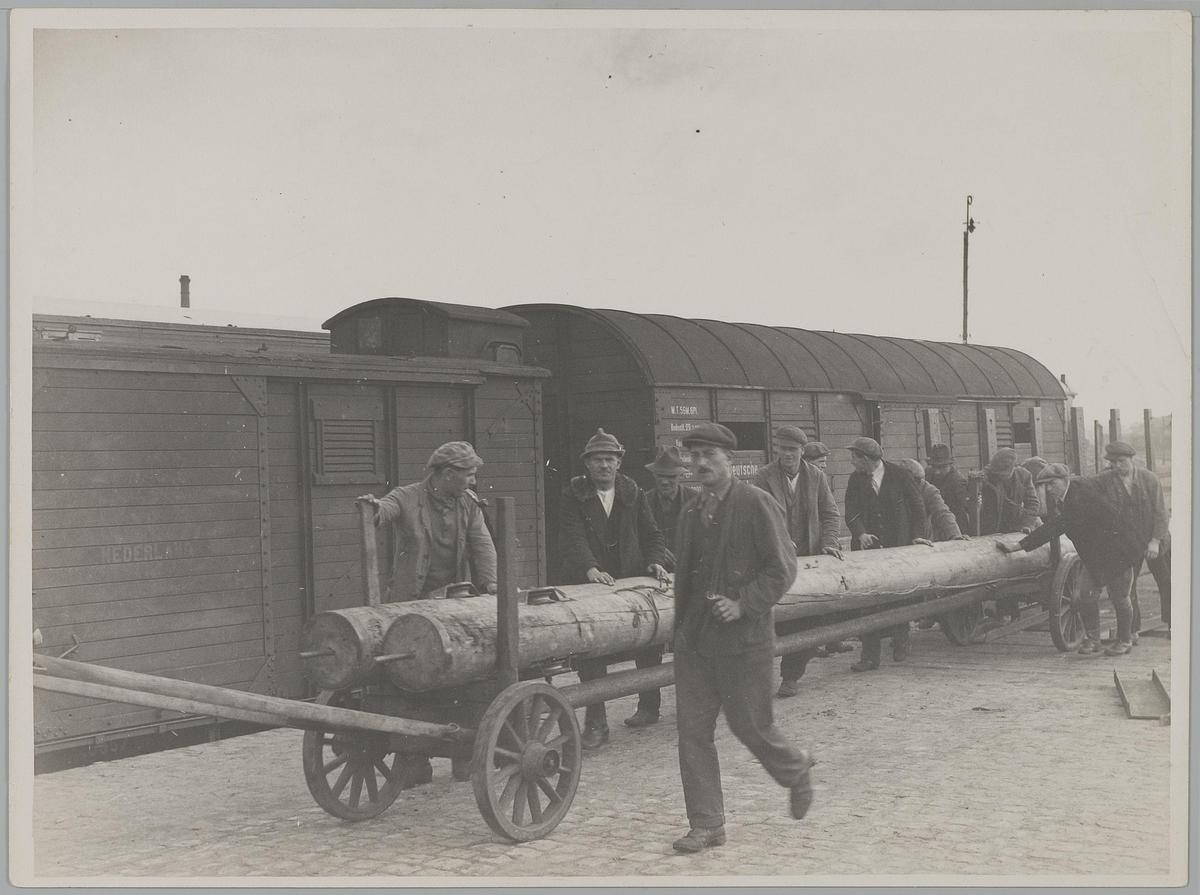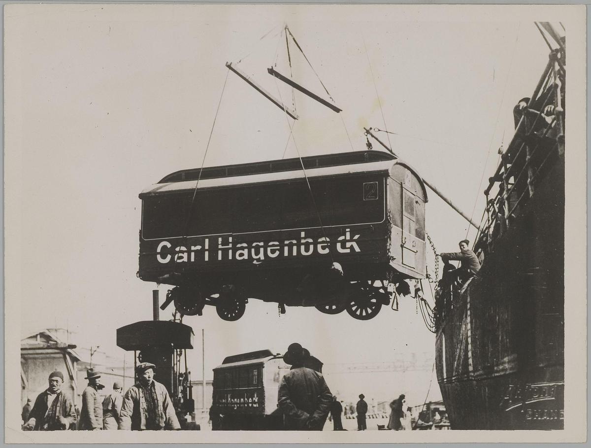 Circus Carl Hagenbeck. Uitladen van de twee houten m...