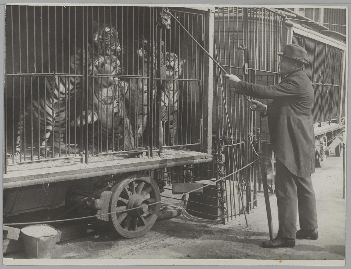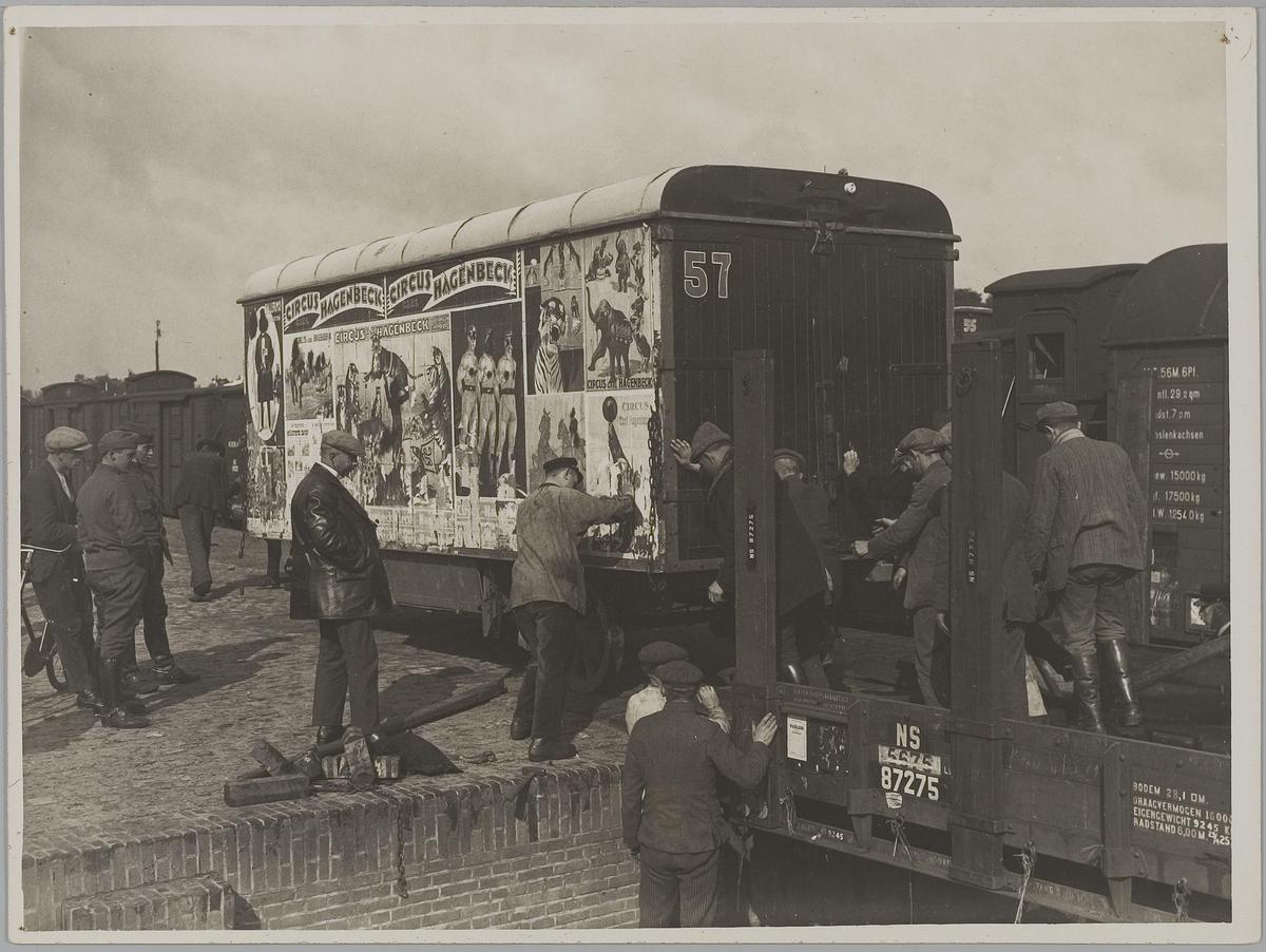 Circus Carl Hagenbeck. Uitladen van beplakte geslote...