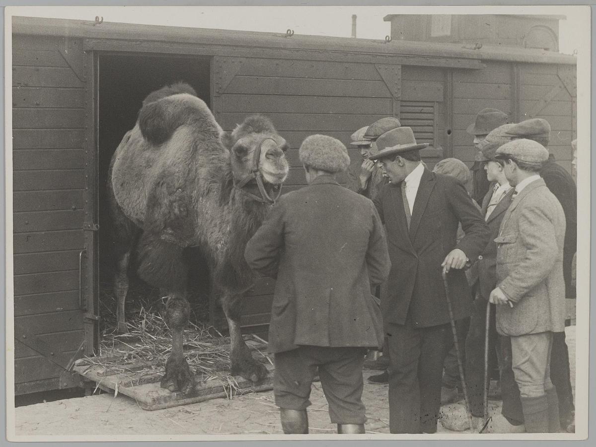 Circus Carl Hagenbeck. Uitladen van kameel. Kopladin...