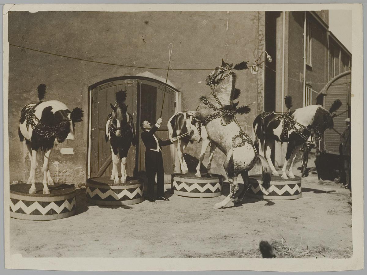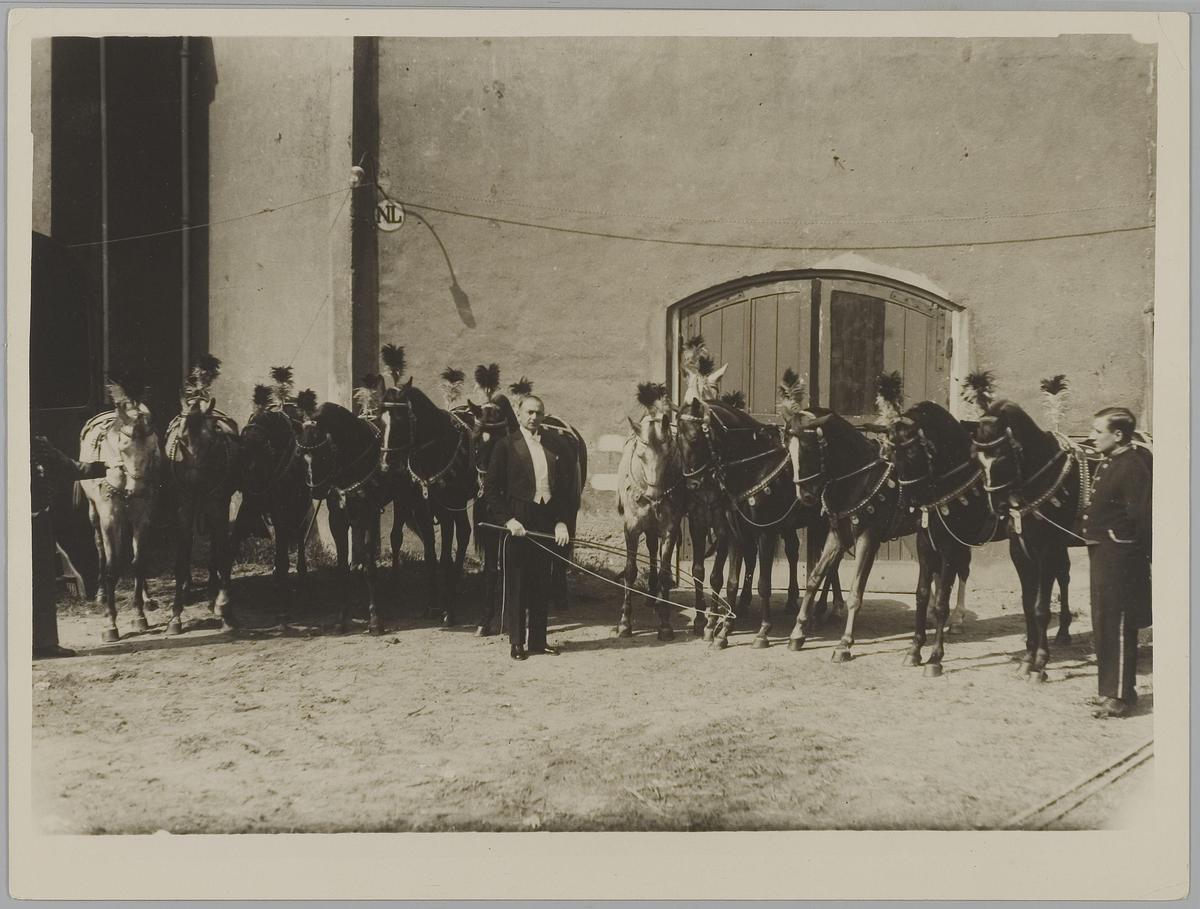 Circus Carl Hagenbeck, groep Trakehner; rechts de dr...