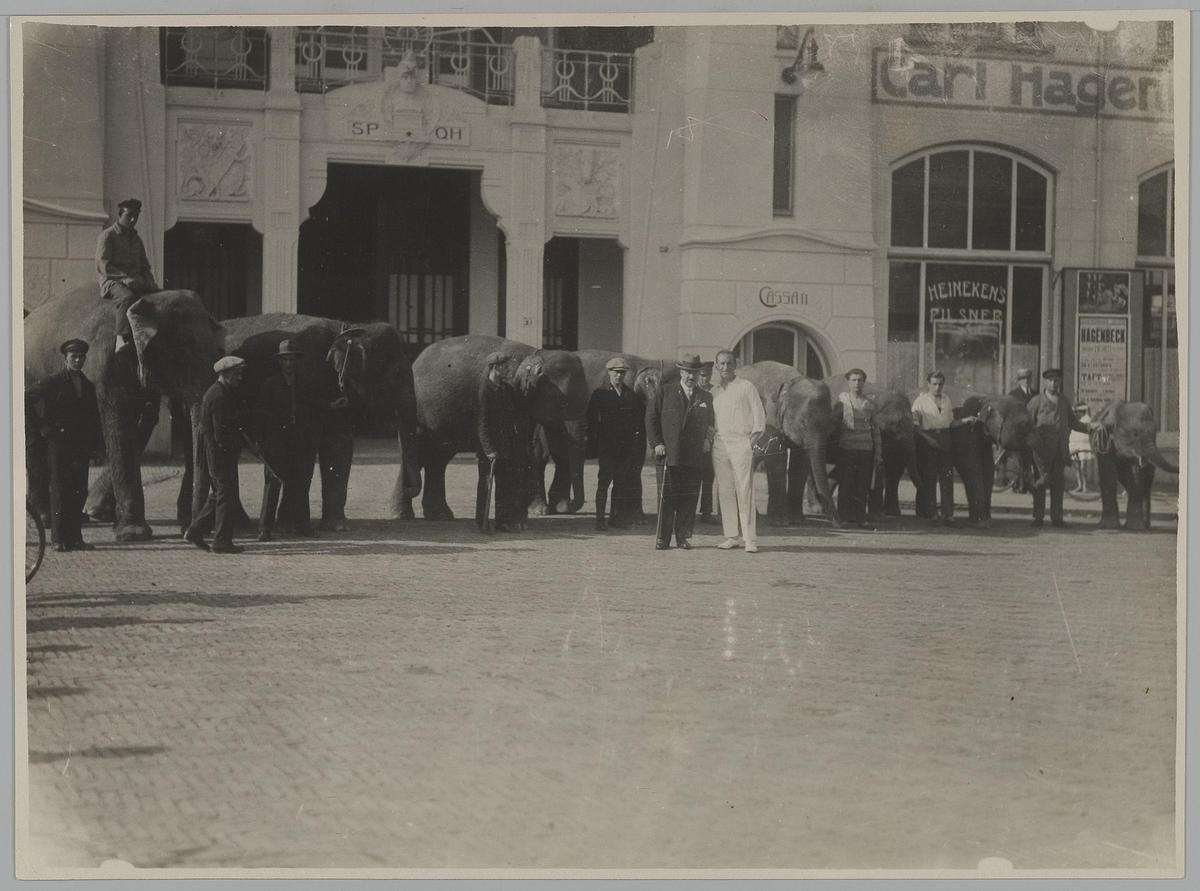 Circus Carl Hagenbeck. Olifanten voor gebouw te Sche...
