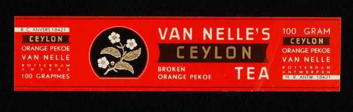 Rood, papieren label VAN NELLE'S CEYLON THEE, peccot...