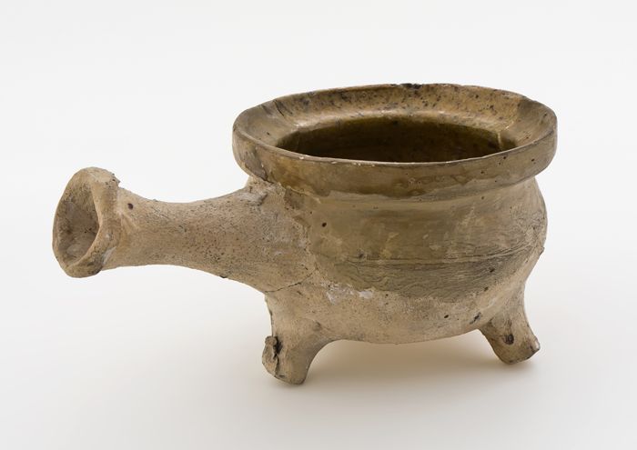 Kleine aardewerk pot op drie poten met trompetvormig...