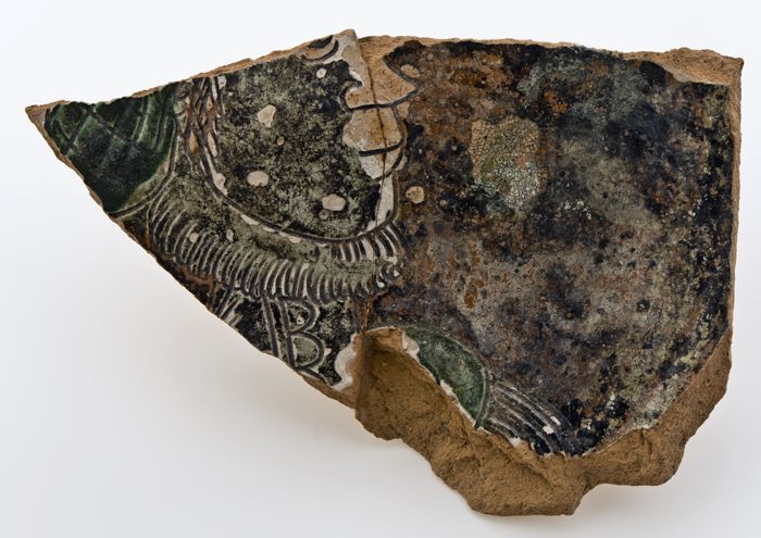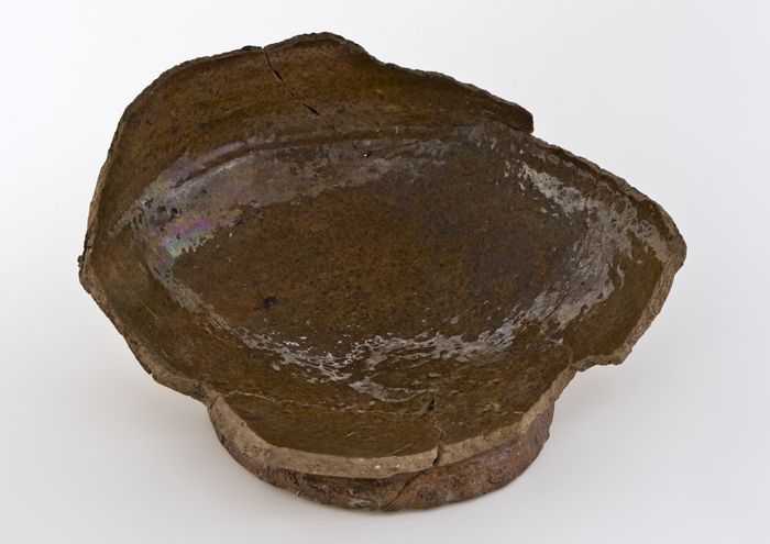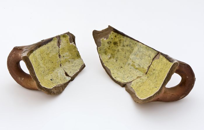 Fragmenten van diepe aardewerk schotel met liggend o...